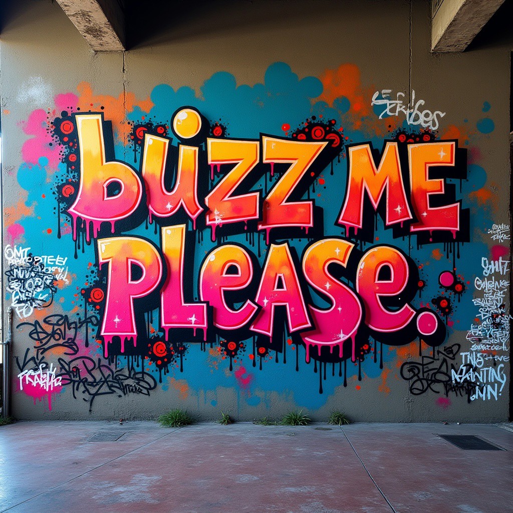 "A vibrant and colorful graffiti wall in an urban setting, featuring bold and stylized text that reads 'buzz me please', spray-painted with dynamic drips and splatters, surrounded by intricate graffiti art, tags, and abstract designs, realistic texture of concrete wall, vibrant neon colors, high contrast, urban atmosphere, gritty yet artistic, photorealistic details, 8K resolution, cinematic lighting, capturing the essence of street art culture, raw and edgy vibe, perfect composition, ultra-detailed, ultra-sharp focus, stunning visual impact."