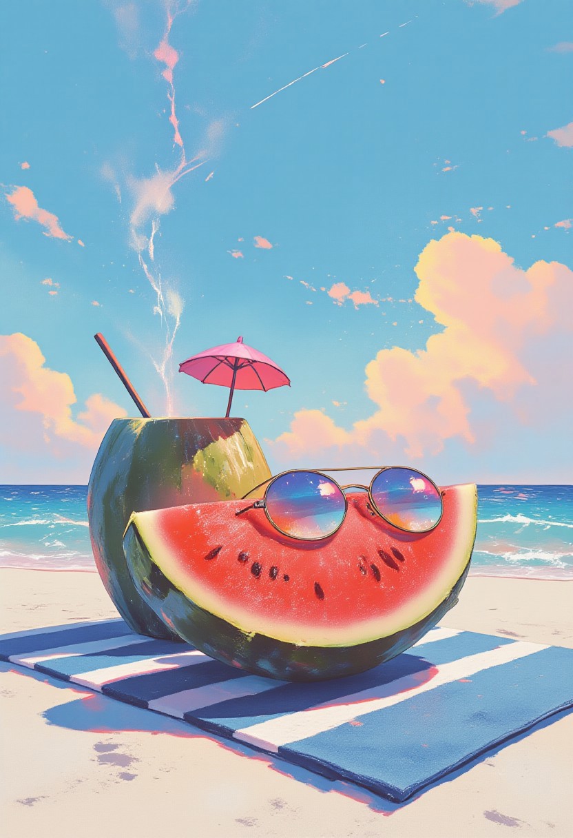 Jeddtlv3, aidmamj6.1, A slice of watermelon lying on a beach towel, wearing sunglasses, sipping from a coconut with a tiny umbrella, with the ocean in the background.