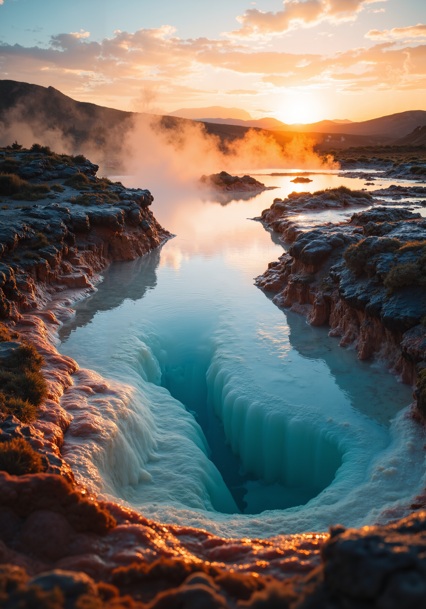 A geothermal pool surrounded by jagged mineral formations, illuminated by the soft golden hues of dusk. Steam rises in delicate wisps, catching the vibrant gradients of ochre, turquoise, and crimson deposits lining the water's edge. The low-angle perspective emphasizes the interplay of light and mist, with intricate details of bubbling water reflecting the fiery sky above. 8k resolution, hyper-detailed textures, and a masterful balance of warm and cool tones create a surreal, tranquil atmosphere. Lush moss clings to weathered rocks, while distant geysers erupt in silent plumes against a backdrop of rolling volcanic hills. <lora:FluxDFaeTasticDetails:0.6> <lora:ArtNouveau2Flux:0.5> <lora:flux_dev:1>