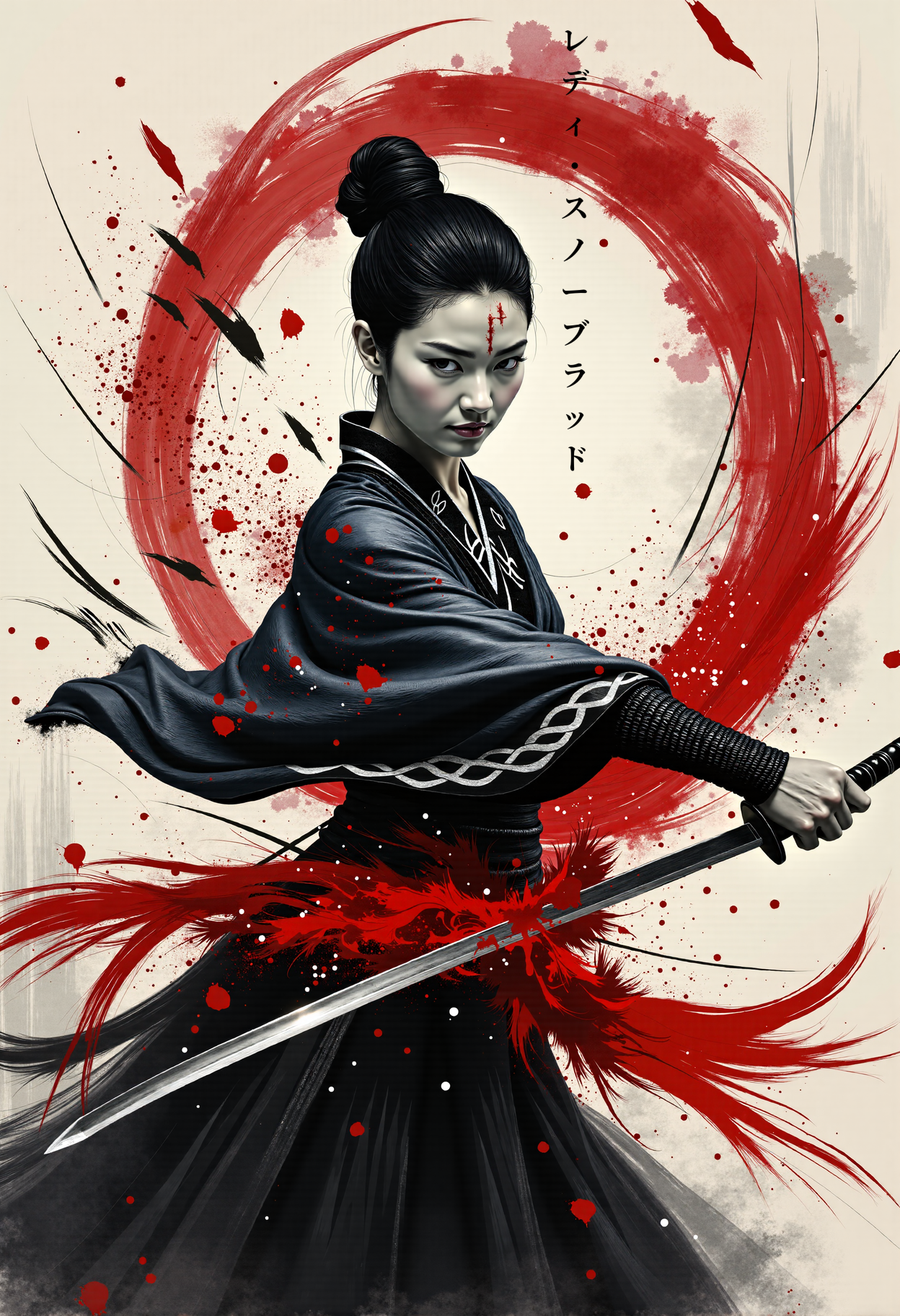 Create an abstract b&w ink painting: A dynamic painting of a woman wielding a sword. The woman is dressed in traditional white clothing with hair tied in a knot, her beautiful face covers in shadow. The scene captures the motion of the sword with bold red and black brushstrokes, creating a dramatic effect. The background is bright, contrasting with the dark and red colors of the figure and brushstrokes. Red splatters and lines add an intense and energetic atmosphere. The painting features a mix of expressionism and abstract art, with symbolic representation of strength and movement. Influences of traditional Japanese art and culture are evident in a dezent monochromatic scheme, primarily with shades of black, white, and red.