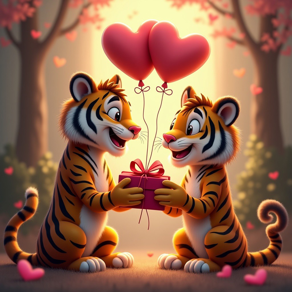 A male tiger, holding heart-shaped balloons, presents a gift to the female tiger, who smiles warmly, surrounded by a soft, romantic atmosphere, feral, realistic,