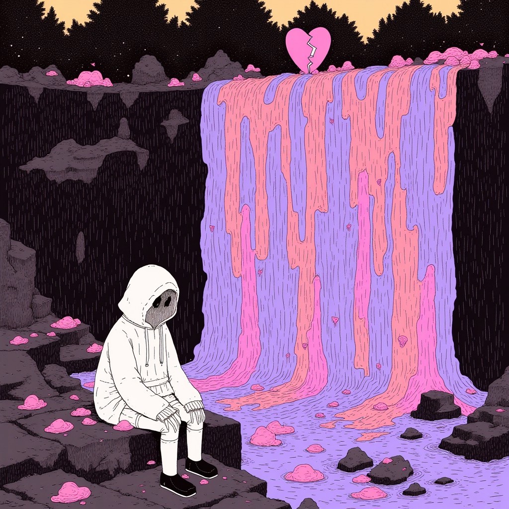 <lora:CreepyCute:1>, CreepyCute, girl in a hoodie sitting on a rock right by a waterfall. The waterfall is a wide array of vivid colors. At the top of the waterfall is a broken heart representing the melancholy of being heartbroken on valentine's day.