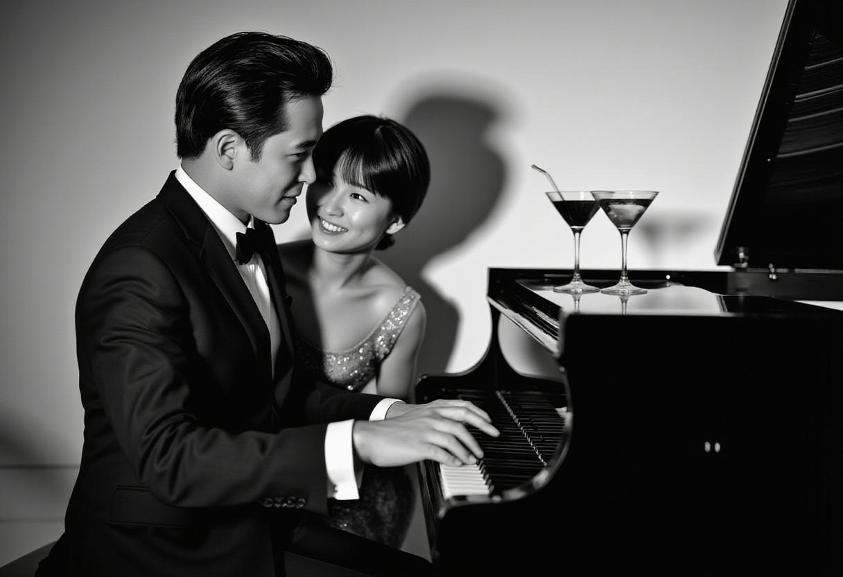 black and white image, 1 man, 1 woman, a handsome Japanese man in formal attire seated at a grand piano, atmosphere of mystery and artistic intensity, classic and somewhat melancholic feel, the central focus is an elegant man with wet slicked-back hair, dressed in a dark suit and bow tie, seated at a grand piano, a beautiful Japanese woman in an elegant evening gown stands behind the piano and leans against it, they look at each other with love, his hands are poised over the piano keys, smirk of complicity on his face, the piano itself is dark, almost black, and its polished surface reflects little light, only the keys are clearly visible adding a stark contrast to the overall dark tones, there are 2 cocktail glasses on the piano, the shadow of the 2 figures is cast on the white wall in the background but indistinct in detail adding a sense of mystery to the scene, the contrast between the sharp clarity of the 2 figures and the shadowy figures behind them creates a visual tension that draws the viewer in, the dark tones and the subdued lighting contribute to the image’s somber and quietly romantic atmosphere, professional photography, side view