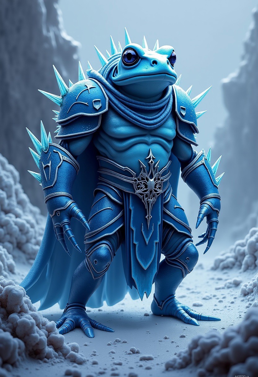 A detailed masterpiece digital art of an anthro dark blue ice frog, dressed in icy viking armor. He has the face of a frog made of ice, surrounded by an aura of cold and ice. He stays in majestic proud sinister pose. His armor and skin are covered in sharp ice crystals. The painting is done in bluish-icy dark tones and is imbued with an ominous frosty aura. In the background is an icy wasteland with many sharp ice rocks.