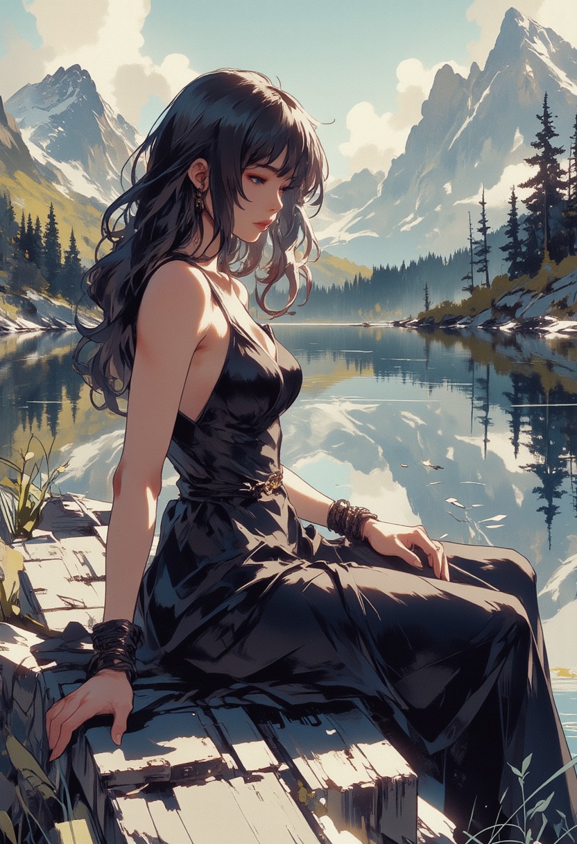 Mh1$AgThS2, intricate linework with expressive contrasts, soft lighting with dynamic highlights, neo-noir portrait, silver halide, young Asian woman in a summer dress, long loose hair, sitting at the end of a jetty on tranquil mountain lake, with mountains in the background, In the style of ff-td