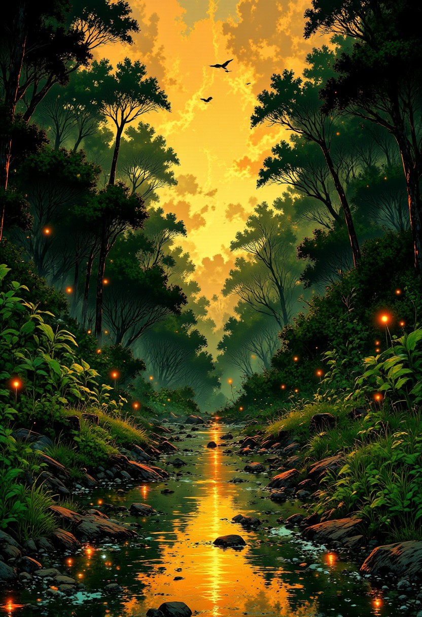 Amazon Rainforest – Lush Green Canopy & Golden Sunbeams "The dense Amazon rainforest is bathed in warm golden light as the sun filters through the thick green canopy. Exotic birds glide through the dappled sunlight, their bright feathers catching the glow. A slow-moving river winds through the jungle, reflecting the warm tones of the setting sun."