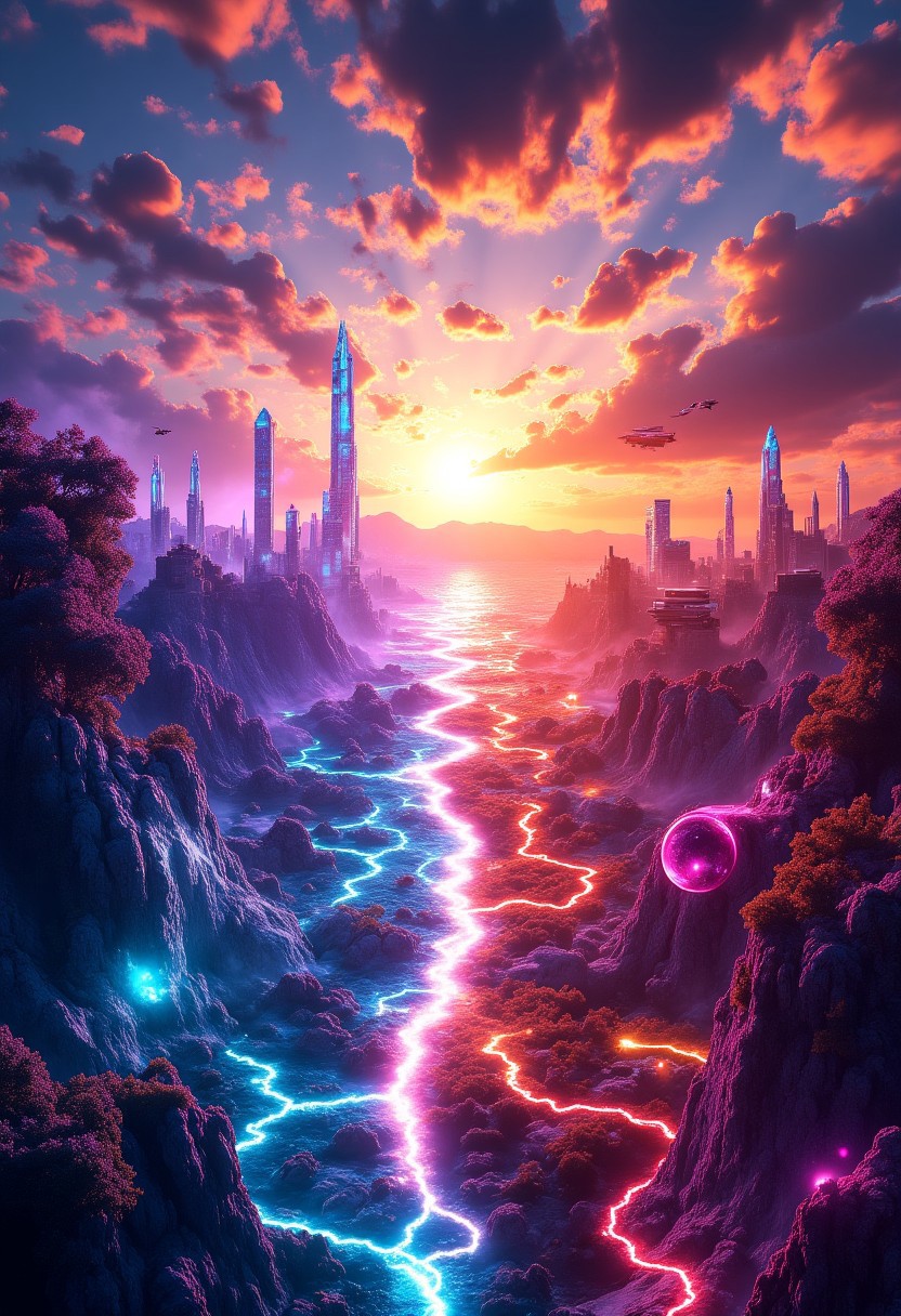 A surreal crystal planet, half wild nature, half futuristic civilization. Left: glowing crystal trees rise from purple mist, roots entwined with shimmering blue rivers, fluorescent creatures dart through a sky of fractured rainbow hues. Right: sharp silver towers pierce the clouds, floating platforms reflect cold light, transparent tubes pulse with energy, starships streak across a dark red horizon. At the border, crystal and steel twist into a lightning-shaped rift, emitting an eerie glow, as if spacetime is torn. Vivid warm-cold contrasts, dynamic tension, and mystery dominate the scene.