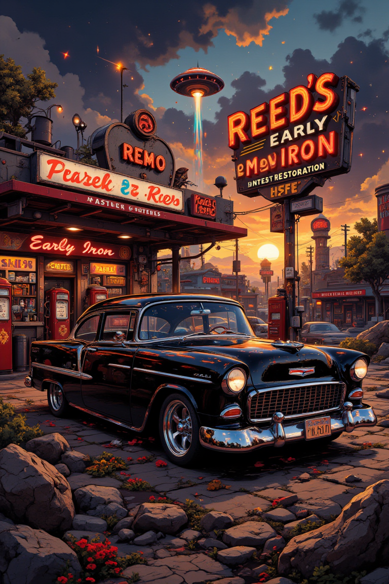 aidmafluxpro1.1, A Close up Side shot of A single flat black 1955 Chevy yes Bel-Air two door classic lowrider car, the car headlights on, sitting outside a large canopy of an old 50s gas station with multiple gas pumps. The car has custom wheels, reflection of light glows in the windshield, (((The main focus is the 1955 Chevy Bel-Air two door Lowrider car))), with the text a Font that says ((((("Reed's Early Iron"))))) with the secondary text ((((("Auto Restoration"))))), The text design is red with silver accents, floating in the air over the car. it must have only five words in the text design. The sky is a Setting sun, A 50s retro saucer, UFO in the distance with only a few colorful raise of light visible through the thick clouds. The atmosphere should be cinematic and highly realistic, capturing the feeling of isolation and quiet dread that something unseen is about to happen. High definition, 8K, highly detailed photo realistic