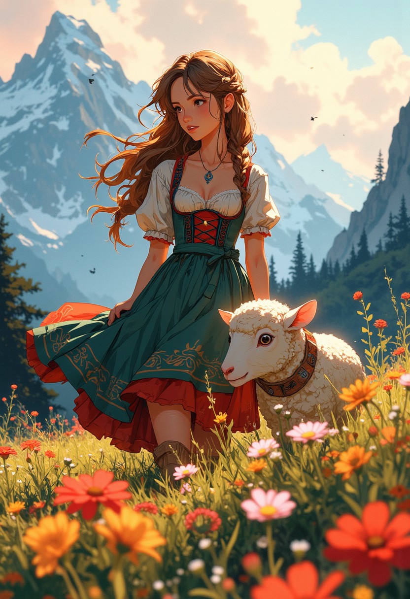 High-resolution anime-style illustration with impressionistic influences, a young woman standing in an alpine meadow, soft warm light filtering through the misty mountains. She wears a beautifully detailed dirndl with a red corset, the embroidered fabric flowing around her as the breeze catches her skirt. Her long, chestnut-brown hair is styled into an intricate braided braid, loose strands framing her serene expression. A a small cute fluffy sheep stands next to her. A blurry foreground of wildflowers adds depth, vibrant colors blending into soft, painterly brushstrokes. The sky glows with warm pastels, distant peaks fading into atmospheric haze, creating a dreamlike, tranquil scene