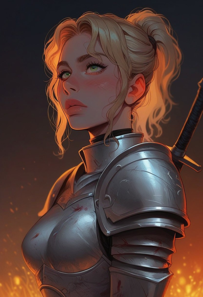 (Score_9, Score_8_up, Extremely detailed, Sharp Focus, Skindentation), Knight in revealing armor, Fantasy world , Battlefield, Erotic lustful face, Detailed round eyes, Soft lips, Ponytail , Straight dirty blonde hair, Green eyes, Detailed revealing armor, Medium perfect breasts, Breast Focus, Dynamic angle of her revealing armor, Unsheathing her short sword, Bodies of enemies around her, Exhausted from battle, Blood on armor and body, Aroused from Murder, Natural light on her perfect skin, Dynamic shadows, (Depth_of_field), Mysterious lights, Vivid sky