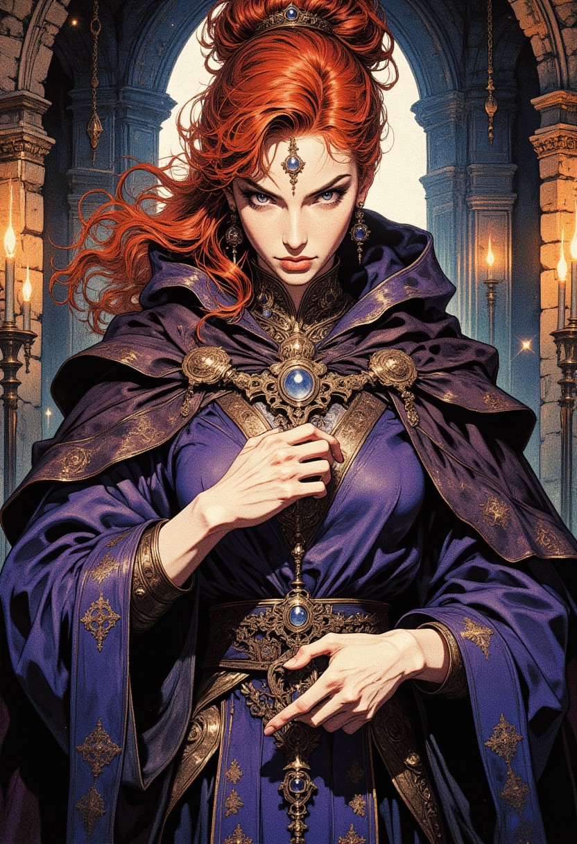A strikingly beautiful young sorceress fiery red hair styled bun, piercing violet eyes, determined expression. Clad ceremonial robes, jeweled amulet neck, holding runic amulet, channeling power pose, overhead angle, dim candlelight, underground dungeon, stone walls torches, dark fantasy illustration, cavern background, medium resolution, strong shadows.,(masterpiece, best quality, absurdres, highres), amazing quality, very aesthetic, (volumetric lighting), digital art style, drawn aesthetic, concept painting, ultrahigh definition.