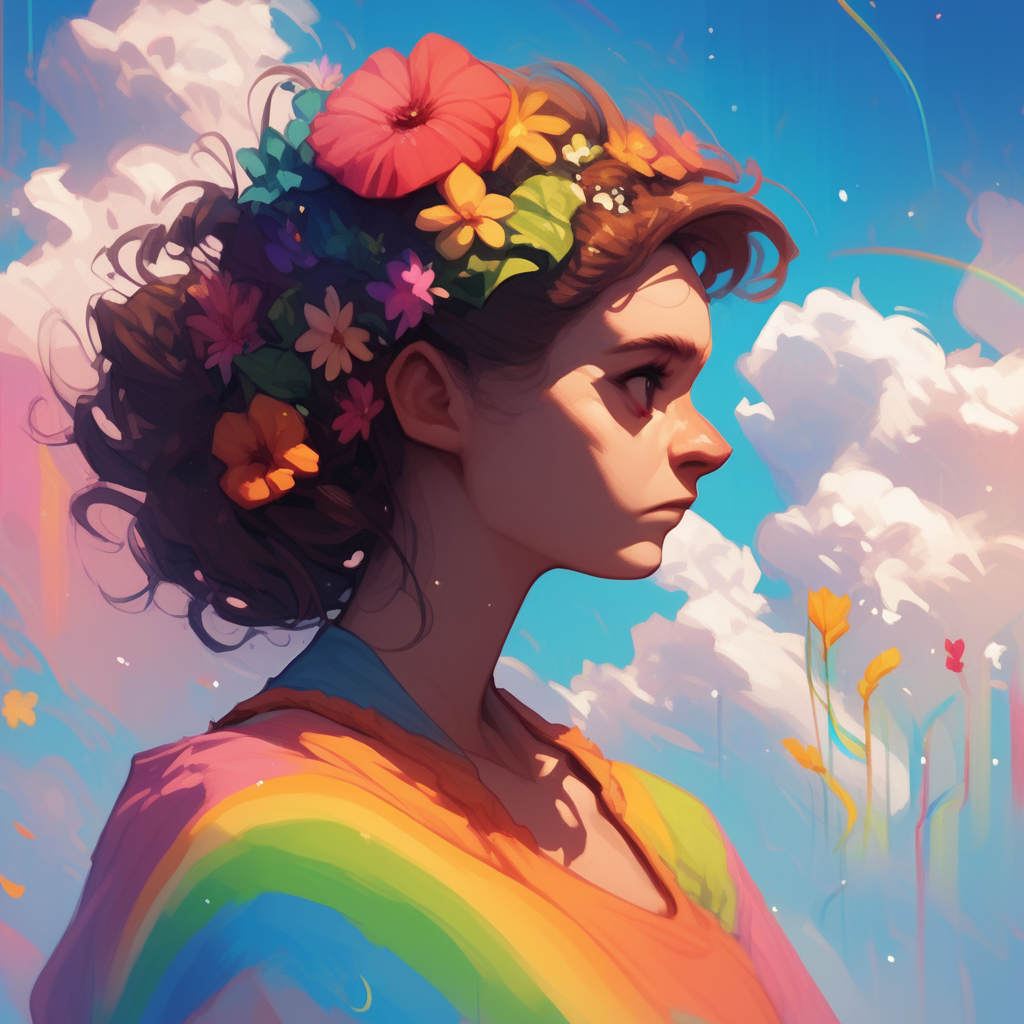 prideb4fall, 1girl, flower, solo, rainbow, colorful, long hair, dress, cloud, hair flower, hair ornament, profile, brown hair, short sleeves, made of rainbows, rainbow overlay, pride month, rainbows, score_9, score_8_up, score_7_up, score_6_up