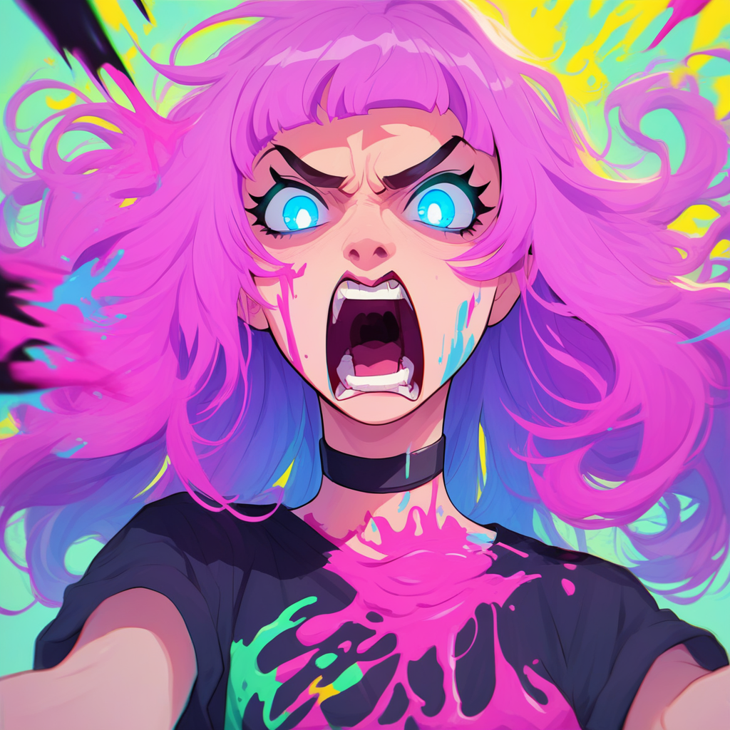 did vaporwave style, 1girl, solo, long hair, choker, open mouth, paint splatter, glowing eyes, black choker, glowing, purple hair, looking at viewer, shirt, multicolored hair, blue eyes, upper body, pink hair, paint, short sleeves, emotional, yelling,, score_9, score_8_up, score_7_up, score_6_up, score_5_up, score_4_up