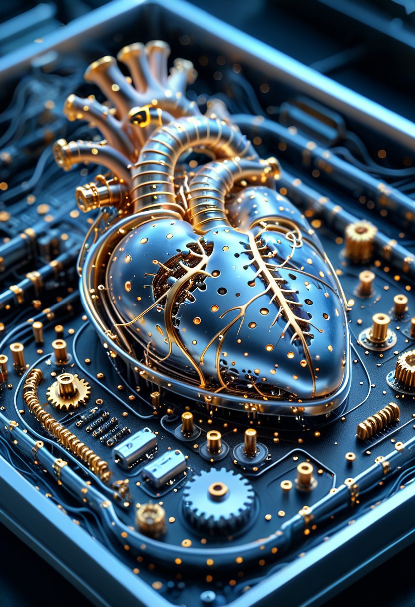 qu4ntum style, 4k, ultra highres, Tilt shift photography style, the anatomical Bioluminescent heart, Gold and silver circuits, gears, wiring mesh, modular panels, silver serving tray on top,