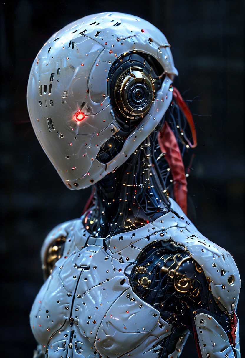 8k, analog photo, masterpiece, best quality, very aesthetic, ultra highres, perfect composition, portrait, from front, 1girl, noface, Bioluminescent cyborg, robot, mechanical ponytail parts, gold visor, white ninja armor suit, red ribbon, simple dark background,