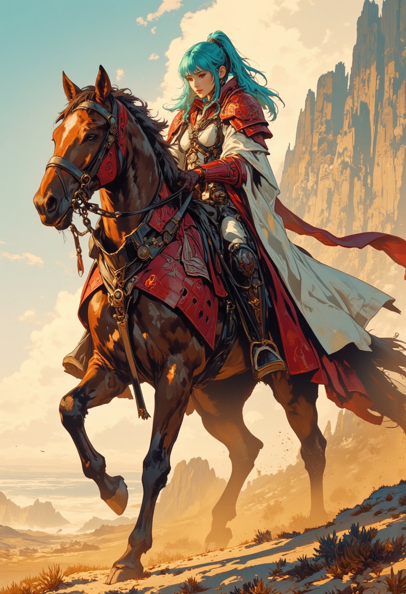 intricate linework with expressive contrasts, soft lighting with dynamic highlights, Impressionistic, ligne claire outlines for clarity and structure, In the style of ff-td, this digital artwork portrays an asian female fantasy knight, crimson plate armour, bangs, long bright blue bioluminescent hair with sidelocks and a high ponytail, riding a galloping horse, with armour protecting its head, across a dusty plain, golden hour, directional lighting