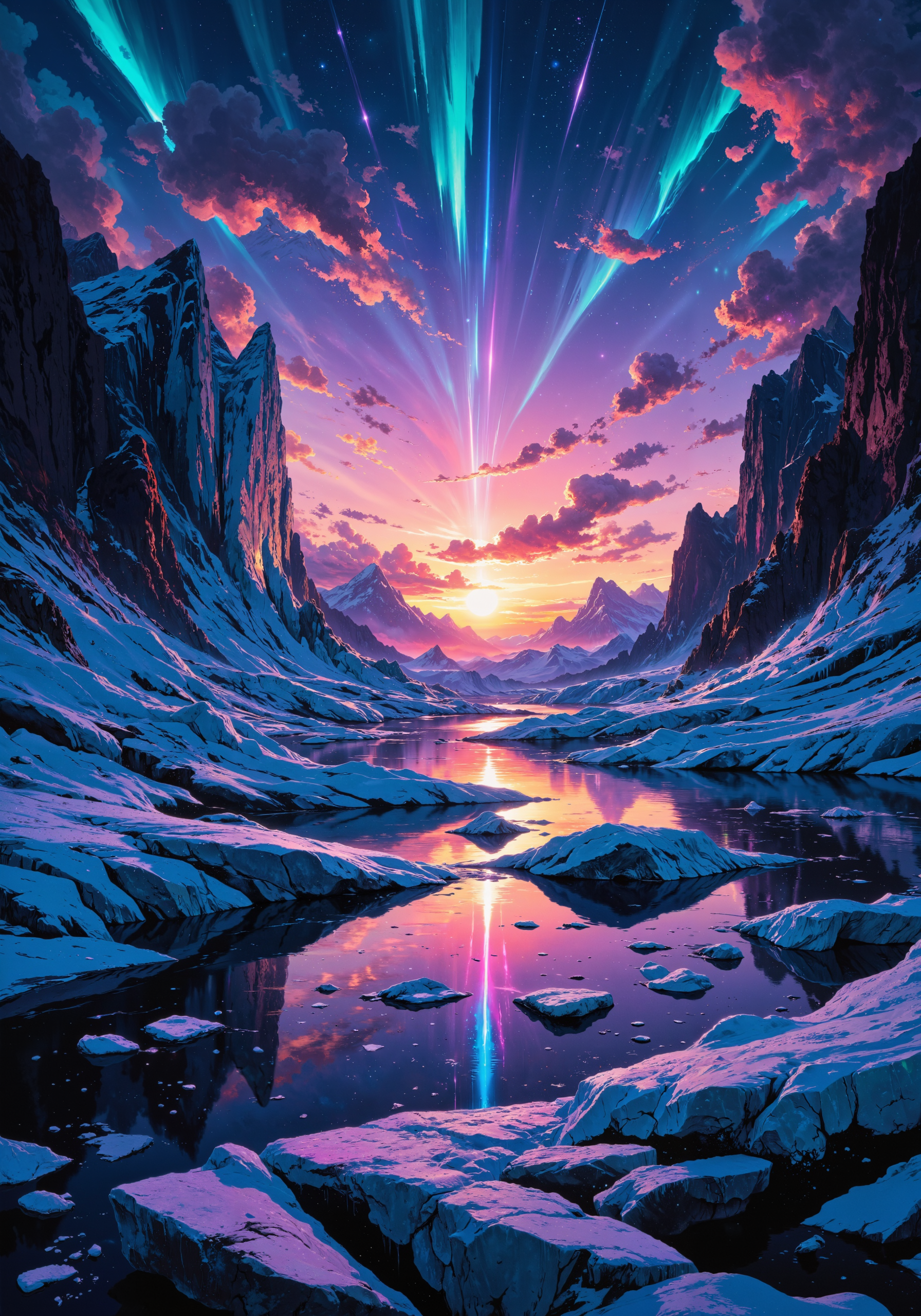 Ethereal twilight over a crystalline ice shelf, where translucent blue-violet geometries fracture the low-hanging sun into prismatic rainbows. Suspended ice crystals create diamond dust phenomena, refracting light into striking crepuscular rays through thin cirrus clouds. The arctic waters below mirror the sky's transition from burning crimson to deep indigo, creating a perfect symmetry of color. Towering ice formations cast long violet shadows across the pristine snow, while distant mountains appear as silhouettes against the fading daylight. Subtle aurora tendrils begin to form overhead, their green and teal wisps delicately intertwining with the sunset's final glow. Hyper-detailed ice textures capture microscopic air bubbles frozen for millennia. Rendered in neo-impressionist technique with visible brushwork capturing the transient quality of arctic light, 8K resolution, masterful volumetric lighting emphasizing the sublime intersection of twilight's ephemeral warmth against the enduring cold. <lora:FluxMythP0rtr4itStyle:0.3> <lora:artilands:0.4> <lora:flux_vividizer:0.7> <lora:RM_Animefy_v1.0M:0.8> <lora:flux_dev:1>