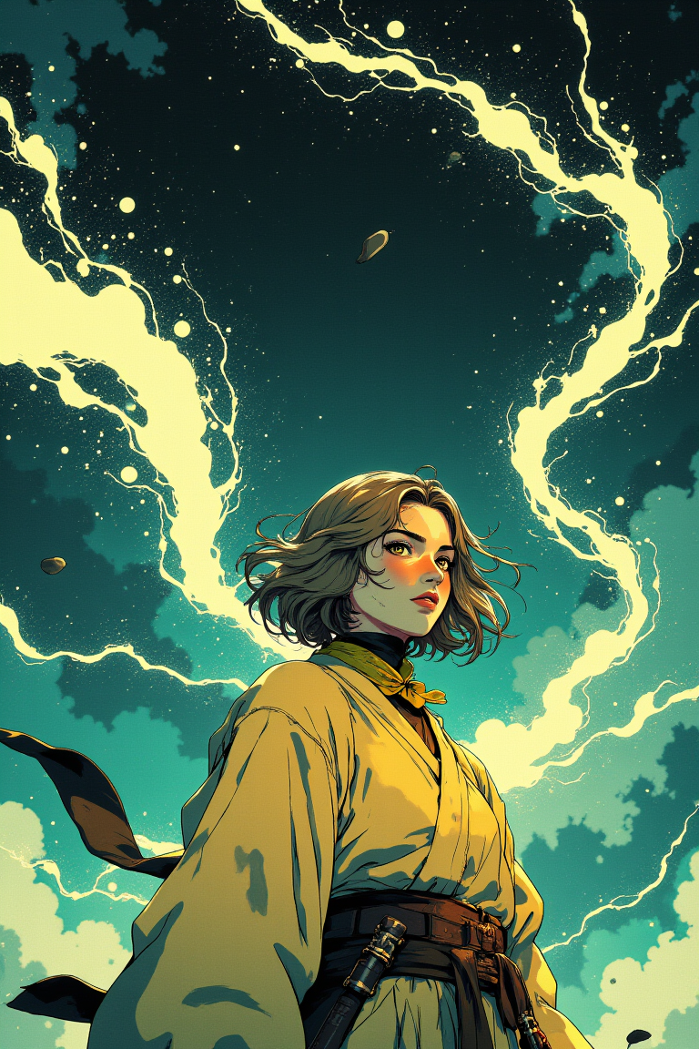 j_art. , masterpiece, best quality, good quality, very aesthetic, absurdres, newest, 8K, depth of field, focused subject, Monochrome with beige, white, bleaked yellow-turqoise color, 1girl Samurai, flowing hair, high collar scarf billowing in storm, shaded eyes, Face Closeup,highly detailed, cinematic Low Angle View, Motion lines And floating particles, darkness within, emitting from His suit are translucent vibrant tendrils that are used AS weapon, deep blacks, high contrast ckym, in the style of ckym