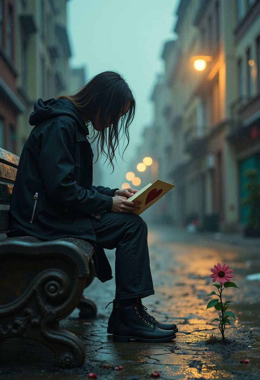 Delve into a scene of introspection and heartache. A solitary figure sits on a weathered bench beneath a rain-soaked streetlamp, clutching a tattered love letter marked with a broken-heart emblem. In the background, muted urban decay and soft, stormy hues reflect the solitude of love lost. Amidst the desolation, a single flower struggles through cracked pavement—a poignant symbol of hope and the bittersweet nature of healing.