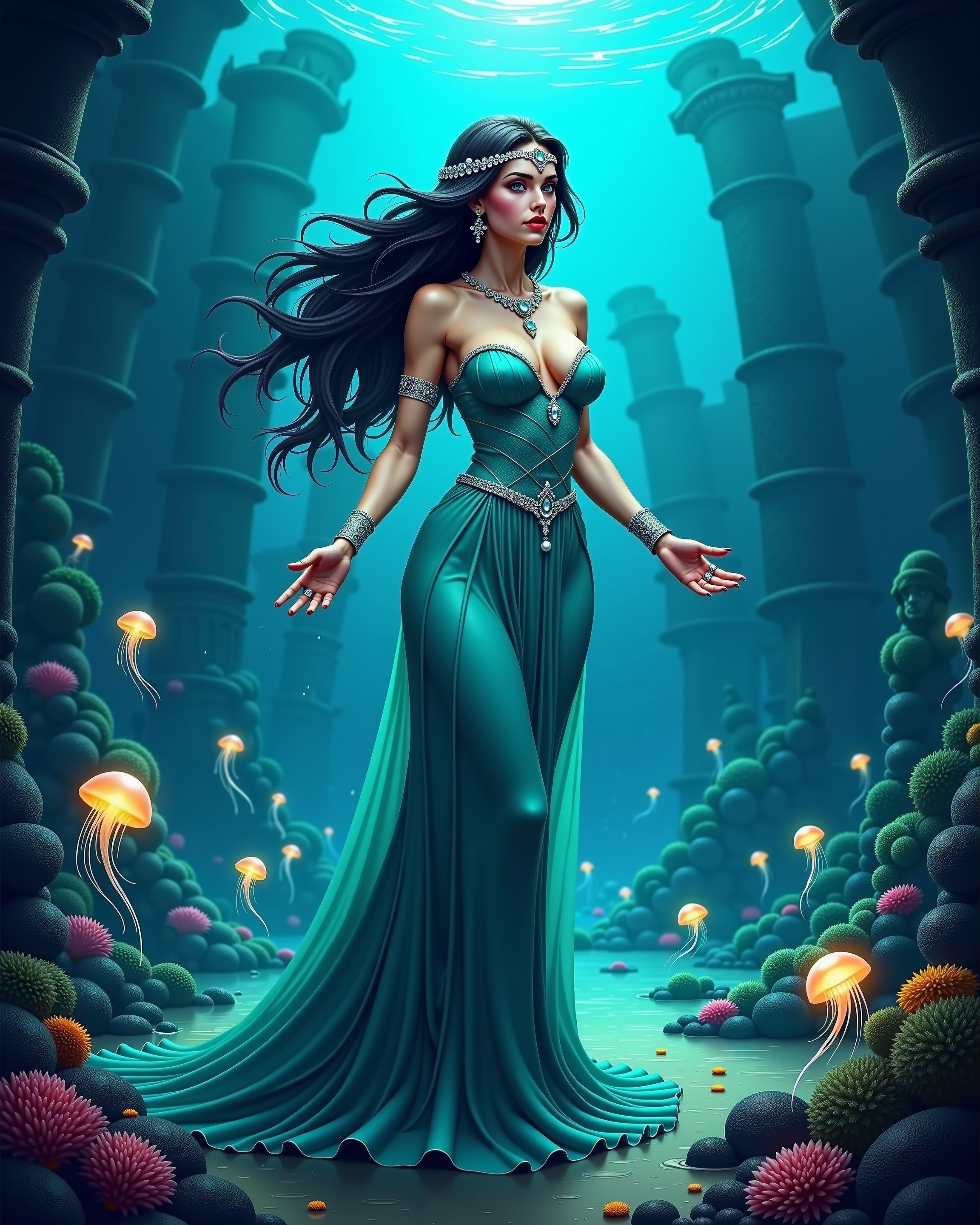 The image is a digital illustration of a majestic woman, dressed in a shimmering, aquamarine-colored gown that seems to be made of the ocean itself, standing amidst an underwater kingdom filled with glowing jellyfish, schools of bioluminescent fish, and coral formations that resemble ancient, ruined cities. Her long, flowing hair waves behind her like seaweed, and her eyes seem to hold the secrets of the deep. She wears a delicate, pearl-encrusted circlet on her forehead, and her hands are adorned with rings that seem to control the ocean's power. The background is a dark, mysterious blue, with faint, glowing lights tracing the outlines of sunken ruins. The overall mood is haunting and majestic.
