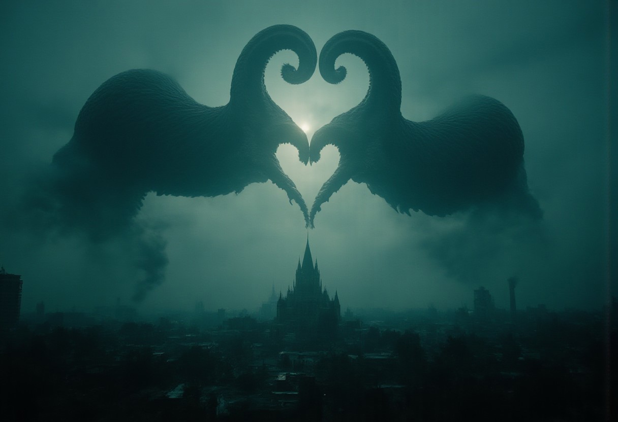 cinematic shot of two massive Cthulhu monsters holding claws over a destroyed city, smoke forming a heart shape between them, night time, foggy, landscape, Short telephoto focal length, masterpiece, hd,