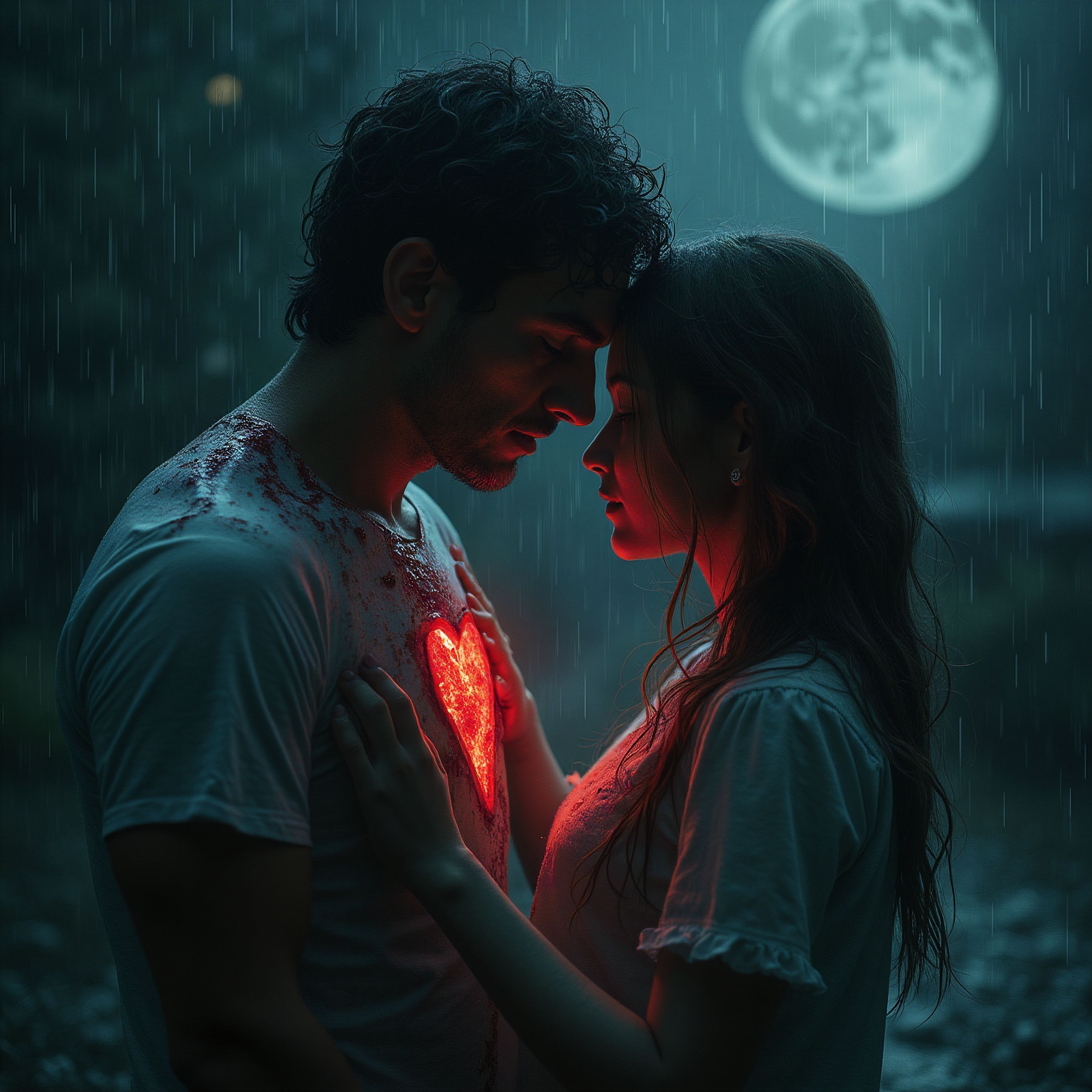 Two individuals stand close to each other under a moonlit sky, with rain falling. The person on the right is touching a glowing heart-shaped bleeding applique on the left person's shirt.