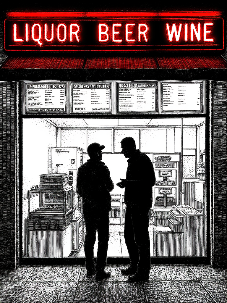ap0770n1a_s41ntc741r. Highly detailed red monochrome ink-drawing with intricate stippling and cross-hatching, by Apollonia Saintclair. two silhouetted figures stand outside a late-night fast food joint, their forms stark against the glowing neon signage above that reads "LIQUOR BEER WINE". The glass storefront reflects the urban night, filled with menu boards, food displays, and deep fryer equipment, rendered in fine stippling and cross-hatching. The figures appear engaged in quiet conversation, one gesturing slightly while the other listens, their expressions obscured by shadows. The textured pavement, faint reflections on the glass, and architectural details add depth and realism. The scene exudes a moody, noir-inspired aesthetic.