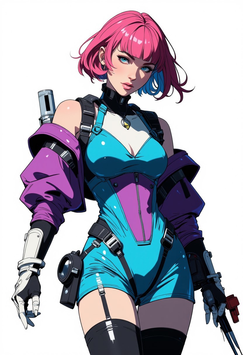 Full body shot, seductive dynamic pose, Anime art. cute very pretty attractive, A breathtaking anime-style full-body illustration of a strikingly beautiful 21-year-old. very pretty, very attractive, Vera is a princess turned space racer mechanic, vibrant colors, bright neon Pink hair, bobcut with bangs but with strands falling over her sharp, bright stunning cyan eyes. She wears a cyan and purple Space racer plugsuit that is unzipped, skirt, dress, long sleeve black cropped high collar jacket, black thigh highs, knee high white boots, racer suit, Captured in stunning ultra-detailed high resolution, with cinematic lighting, this masterpiece exudes undeniable allure, empty white background ensures all focus remains on her, 8k resolution, score_9, score_8_up, score_7_up, absolute masterpiece, ultra detailed, best quality, masterpiece, colorful, highest detailed), (intricate details), (dynamic angle), (ultra-detailed), sexy and seductive, grid girl,