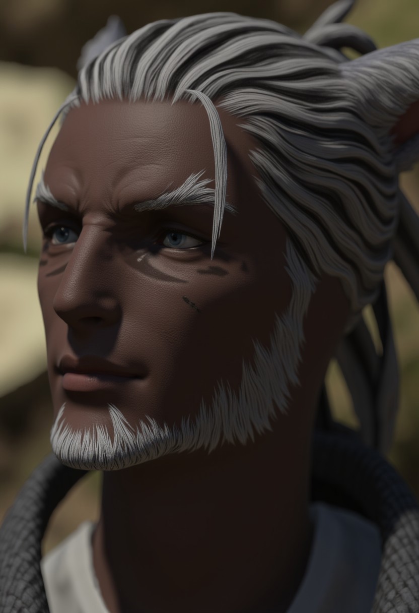 A cinematic shot, catboy, solo, animal ears, dark skin, 1boy, face_2_xiv, dark-skinned male, male focus, dreadlocks, facial hair, cat ears, white hair, beard, portrait, braid, facial mark, white eyes, closed mouth, miqo'te, ffxiv, 3d