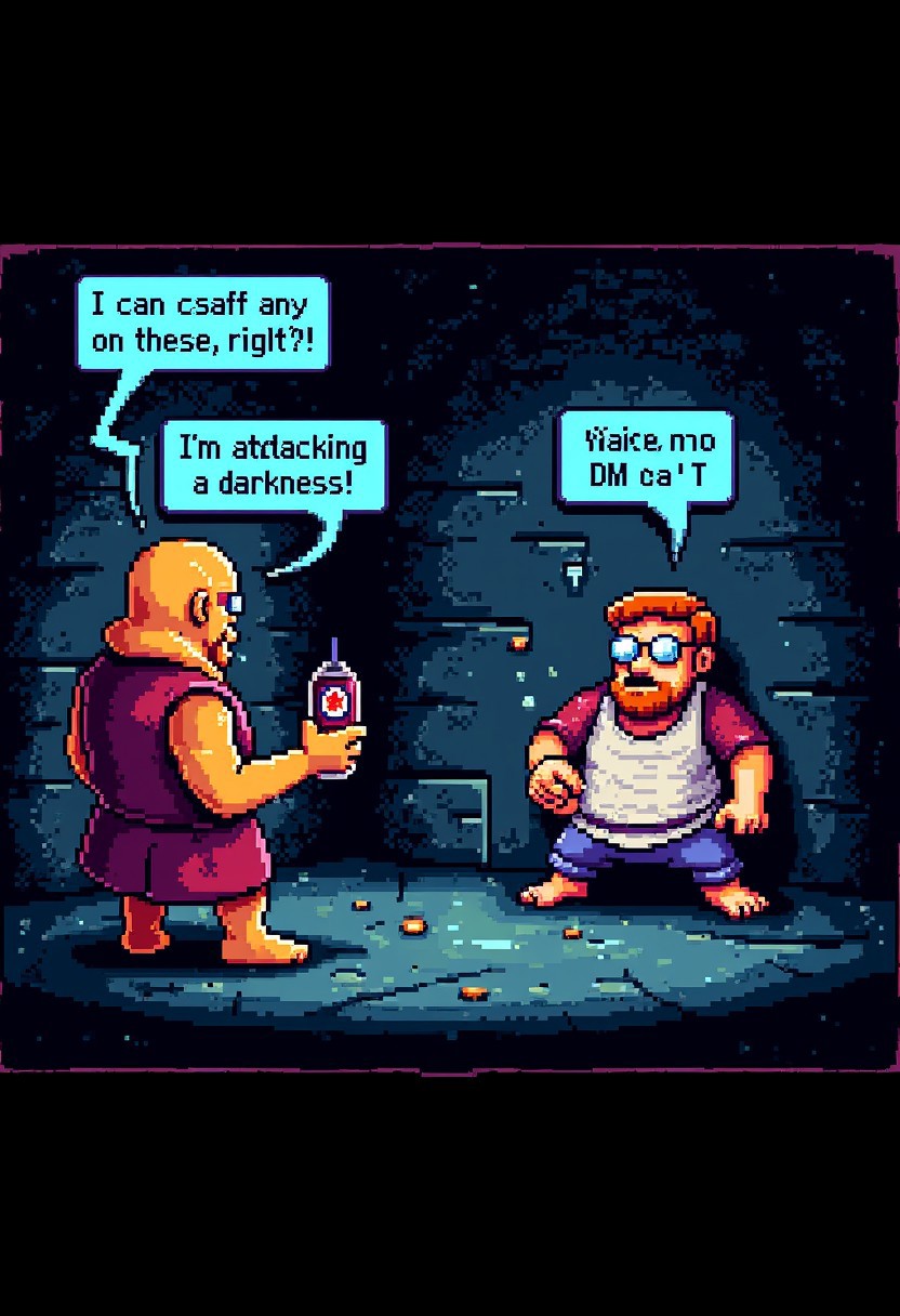 (8-bit Dungeons and Dragons scene:1.5) featuring (Golstaff:1.3) casting (Magic Missile:1.4) in a dark room, (Cheeto:1.2) holding a soda, (dialogue bubbles:1.2) displaying snippets like “I can cast any of these, right?” and “I’m attacking the darkness!”, (pixelated DM:1.3) looking confused, (mildew-covered walls:1.2), vibrant pixel art style, (humorous atmosphere:1.5), with (glitch effects:1.3) enhancing the retro feel, evoking nostalgia for classic gaming sessions