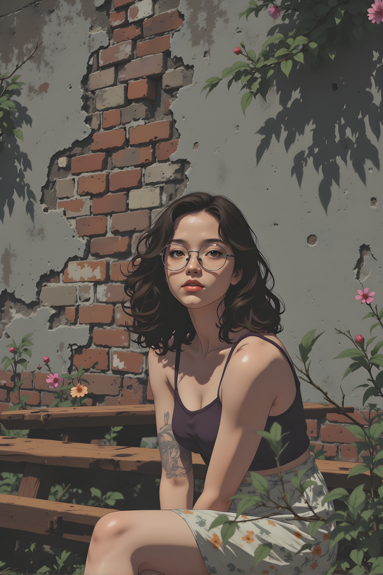 Portrait of a person sitting on a wooden bench in front of a weathered brick wall. The individual has shoulder-length, wavy hair and is wearing glasses, which add to their thoughtful and introspective expression. They are dressed in a sleeveless top and a floral skirt, with a tattoo visible on their upper arm. The background features a rustic brick wall with patches of peeling paint and some greenery, including leaves and flowers that partially obscure the view. The lighting is soft and natural, creating a warm and inviting atmosphere. The colors are muted and earthy, with shades of gray, brown, and green dominating the scene. The person's pose is relaxed and casual, with one leg crossed over the other and their hands resting on their lap. Their gaze is directed towards the camera, creating a direct and engaging connection with the viewer. The overall composition is balanced, with the person positioned slightly off-center, drawing the viewer's eye across the image. Overall, this image captures a moment of quiet reflection and tranquility, with the combination of the person's attire, the rustic setting, and the soft lighting creating a visually engaging and emotionally resonant scene. The use of color, texture, and composition adds depth and character to the photograph, making it a powerful and memorable piece. BREAK j_art, anime, anime art, <lora:J_Anime:1.0>