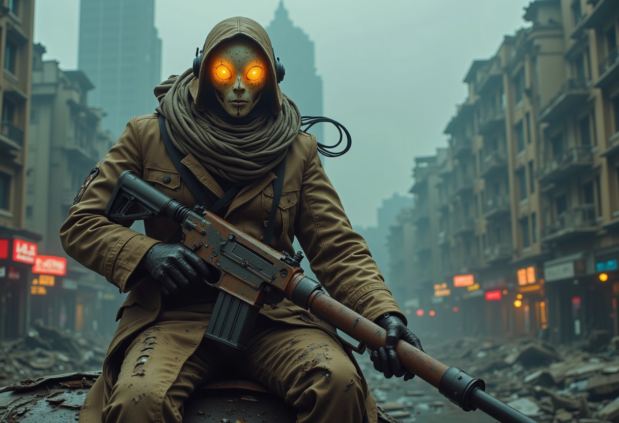 enistyle, A cinematic wide-angle shot of a ruined, cyberpunk metropolis drowning in acid rain. Skyscrapers lean, half-collapsed, their neon signs flickering erratically, casting eerie, broken reflections in the flooded streets. The skyline is choked with smog, with distant fires staining the clouds in a sickly orange glow. A lone figure stands atop a wrecked armored vehicle, a heavy, tattered trench coat billowing in the toxic wind. Their helmet—scarred and cracked—reveals glimpses of a ghostly, cybernetic face beneath. In their hands, a massive, rusted weapon hums with unstable energy, its glow the only thing keeping the encroaching shadows at bay. The air is thick with tension, a world where survival is a gamble and mercy is extinct.