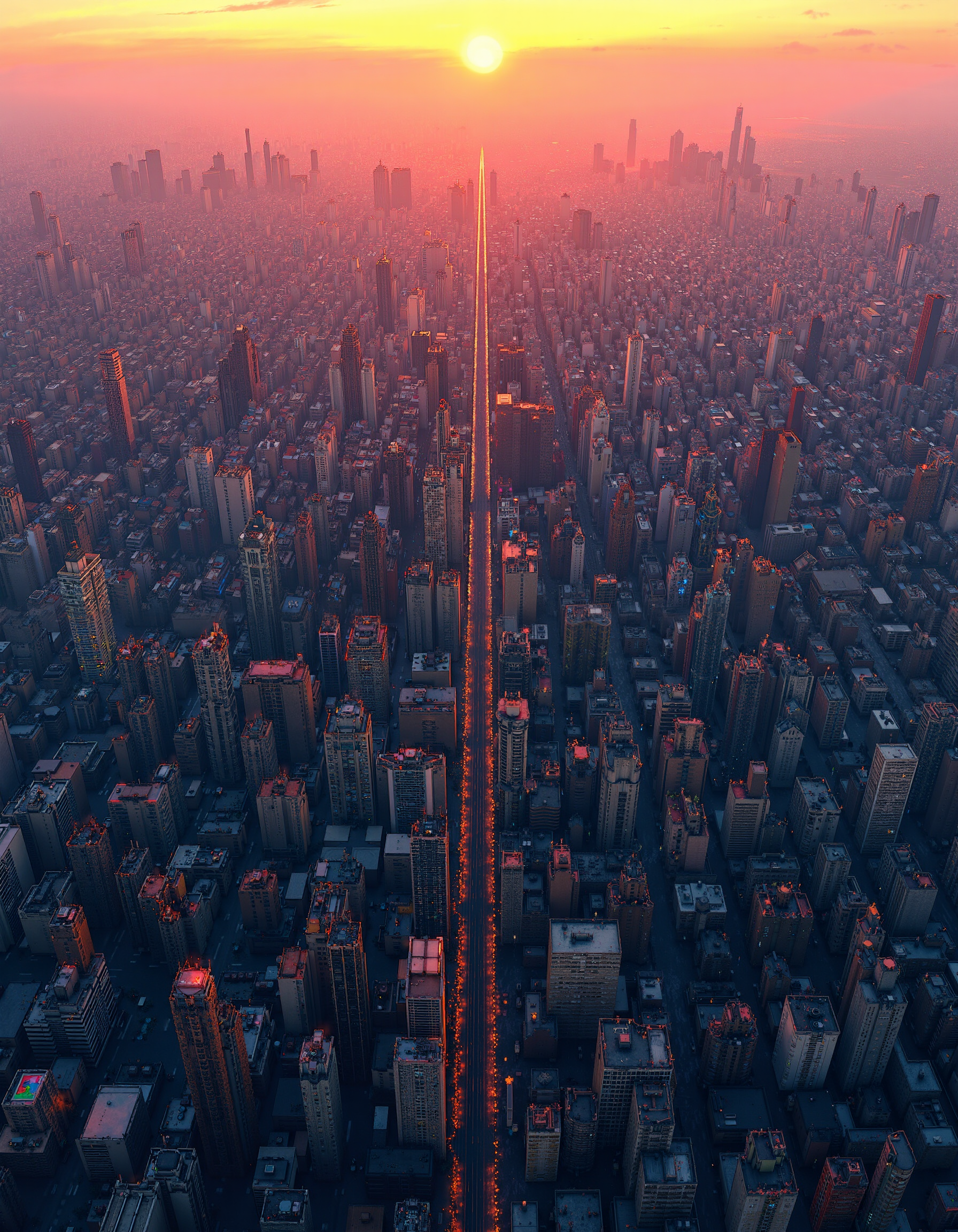 A serene bird's eye view of Tokyo at sunset, with gentle, warm light casting long shadows across the city's intricate network, emphasizing the contrast between bright, colorful skyscrapers and dark alleys, employing a subtle chiaroscuro lighting effect reminiscent of Akira Kurosawa's visual style, with a slight warm color grading and fine film grain, capturing the city's hyper-detailed textures and vibrant hues. The painting is in the style of umesky. <lora:ume_sky_v2:1>