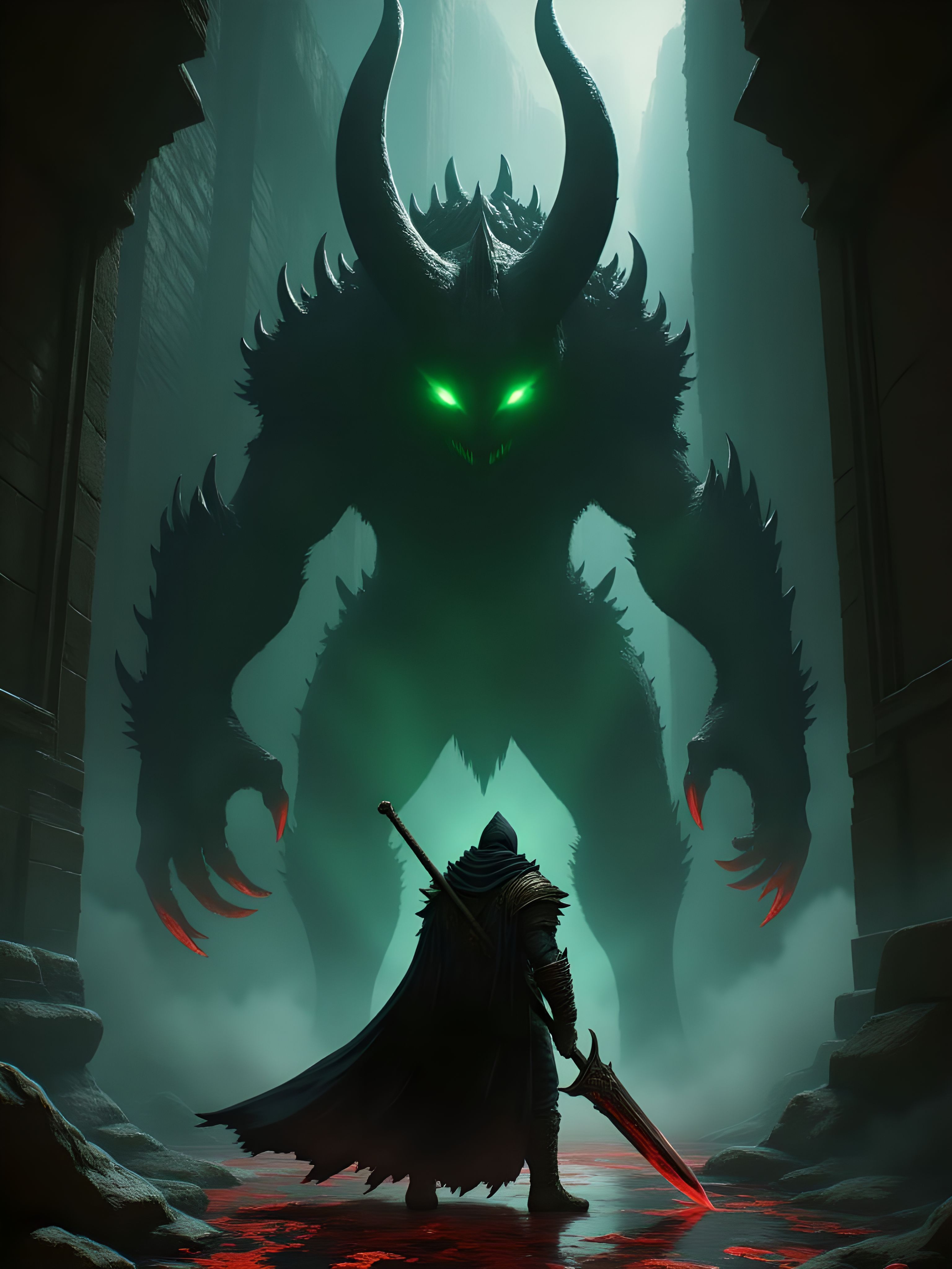 A lone warrior stands in a dimly lit, ancient hall, gripping a massive greatsword. His green eyes glow with determination as blood pools on the ground around him. A monstrous foe looms before him—its grotesque form adorned with extra legs and razor-sharp claws. The air is thick with tension, the faint glint of steel reflecting in the low light. Shadows flicker against the cold stone walls, and the silence is broken only by the warrior’s heavy breath, preparing for a brutal boss fight. aidmaimageupgrader, aidmaMJ6.1m, detailmaximizer, mythp0rt, ne0nfant4sy, translucent, reedy, nistyle, drkfnts <lora:aidmaImageUpgrader-FLUX-V0.2:0.8> <lora:aidmaMJ6.1_aidmaMJ6.1-FLUX-v0.4:0.8> <lora:ne0nfant4sy_NeonFantasyPrimeFLUX-000049:0.7>