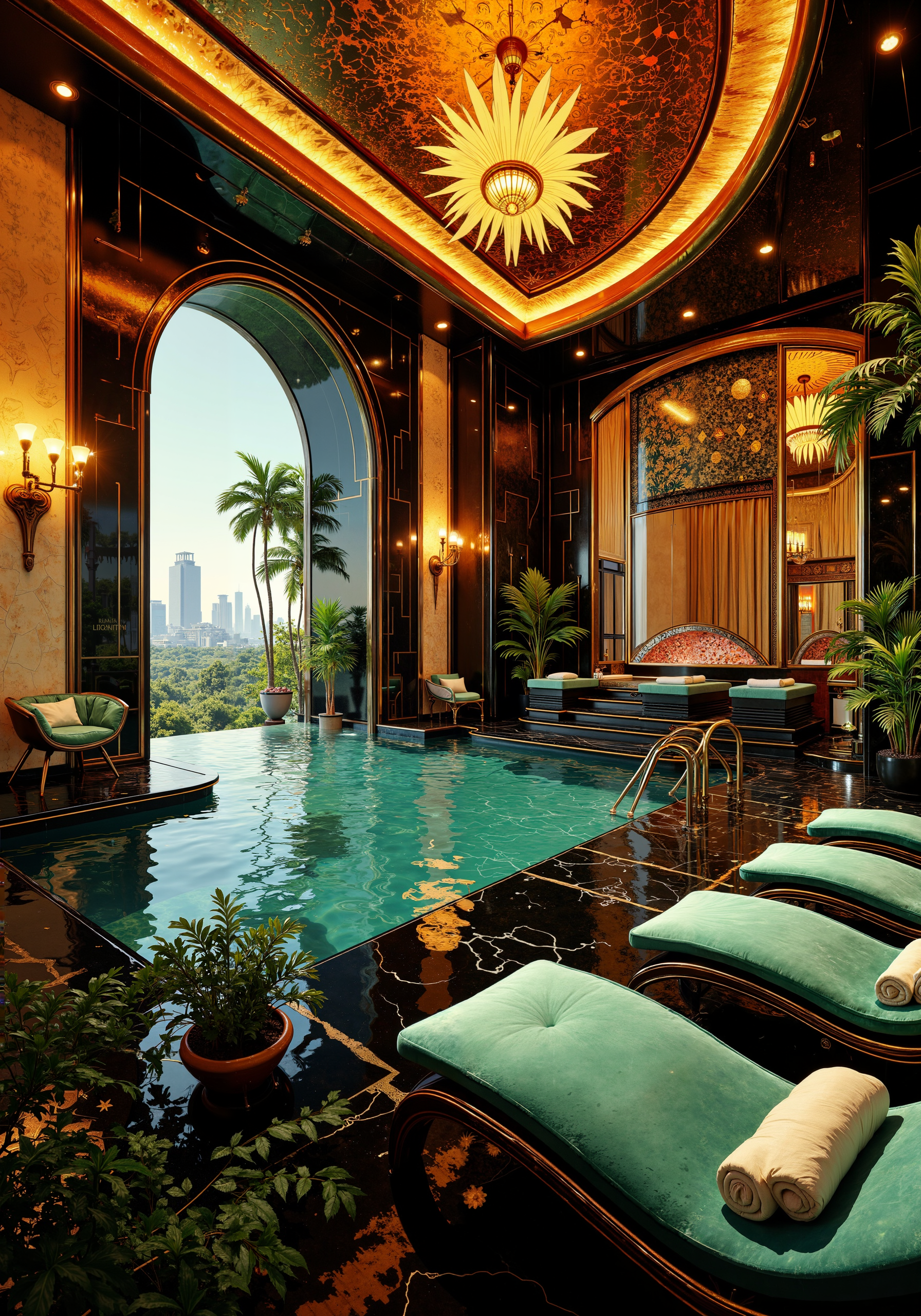 Opulent Art Deco spa, gilded geometric patterns, black marble floors, champagne-gold accents. Sunburst chandeliers cast warm light on jade-green velvet chaise lounges. Curved glass walls reveal infinity pool overlooking city skyline. Ornate brass fixtures, mirrored columns, palm frond motifs. Stepped waterfall feature with rose quartz stones. Luxurious treatment rooms with mother-of-pearl inlays, silk draperies. Glasshouse conservatory filled with exotic orchids, ferns. Circular steam room tiled in iridescent mosaics. Ambient jazz music, subtle incense aroma. Masterpiece, hyper-detailed, 8K resolution, cinematic lighting, photorealistic render. <lora:reedy-art-style:0.5> <lora:Fluxartis 28.11A:0.2> <lora:flux_dev:1>