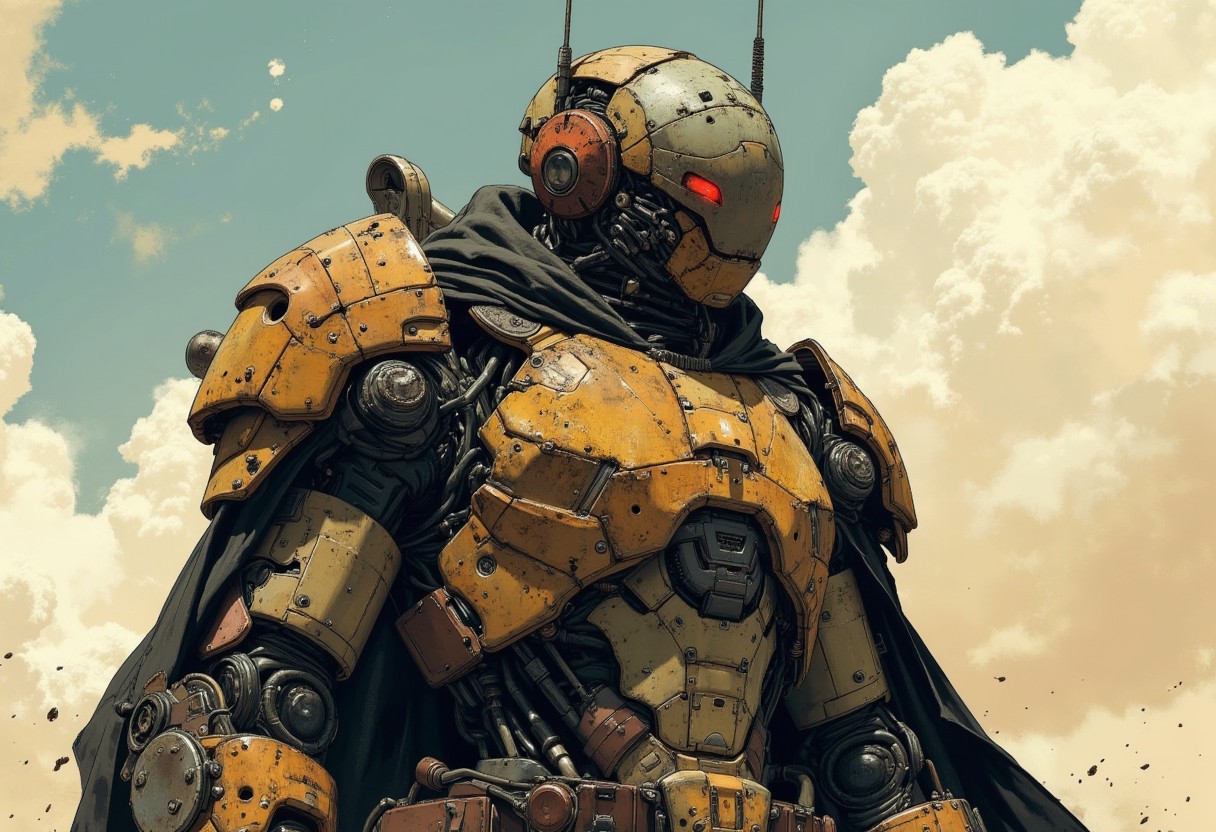 A digital illustration shoot from a side angle about a futuristic massive robot with a human like body, it has black reinforced plating, large shoulder pads, and complex mechanical joints. Its head is like a knights helmet, it has a slit like visor which has small glowing red dots, it contains multiple metallic elements, giving the character a rugged, battle-hardened look. The character exudes strength and resilience, with an imposing and intimidating stance, it has a sleek, metallic design with a black cape draped over its shoulders. the background is a cloudy sky with a mix of blue and beige hues, giving the image a sci-fi and futuristic feel. the overall color palette is warm and earthy, with a focus on the robot's intricate details and futuristic design.