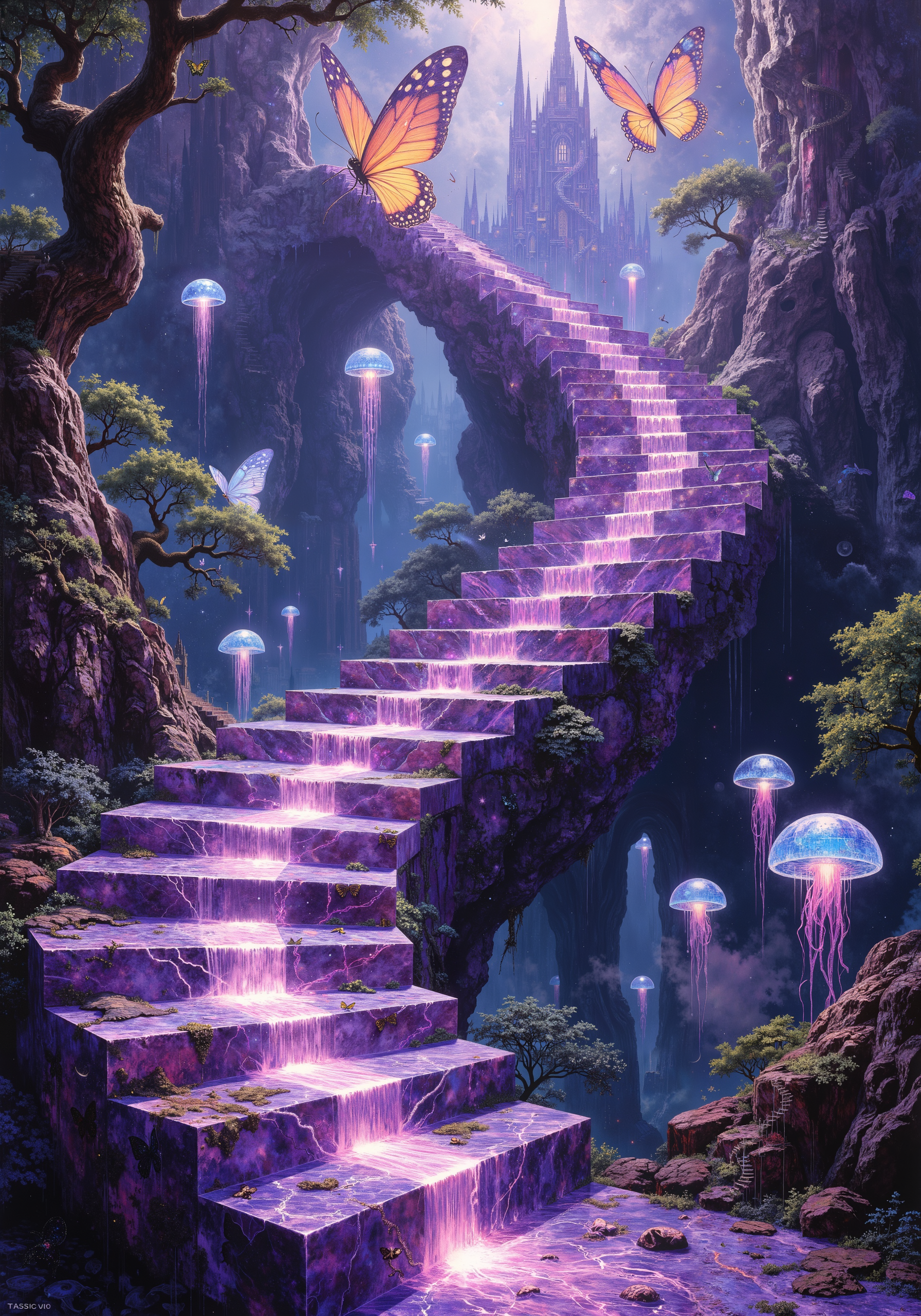 Hyperdimensional clockwork butterflies with wings of shimmering circuitry and gears emerge from a colossal, pulsating amethyst crystal suspended in a void of liquid mercury. Each butterfly trails ribbons of iridescent binary code that weave an impossible Escher-like staircase spiraling into infinity. Titanic bonsai trees with leaves of miniature galaxies grow from the steps, their roots dripping stardust into swirling nebulae below. Translucent jellyfish with bodies of flowing lava and tentacles of neon plasma float serenely through the scene, leaving trails of fractalized memories in their wake. In the distance, a cathedral made of interlocking Möbius strips and Klein bottles slowly deconstructs and reassembles itself in a mesmerizing dance of non-Euclidean geometry. 8K resolution, hyper-detailed, vibrant colors, surrealist masterpiece. <lora:Mezzotint_Artstyle_for_Flux_-_by_Ethanar:0.3> <lora:Vintage comic book:0.7> <lora:flux_dev:1>