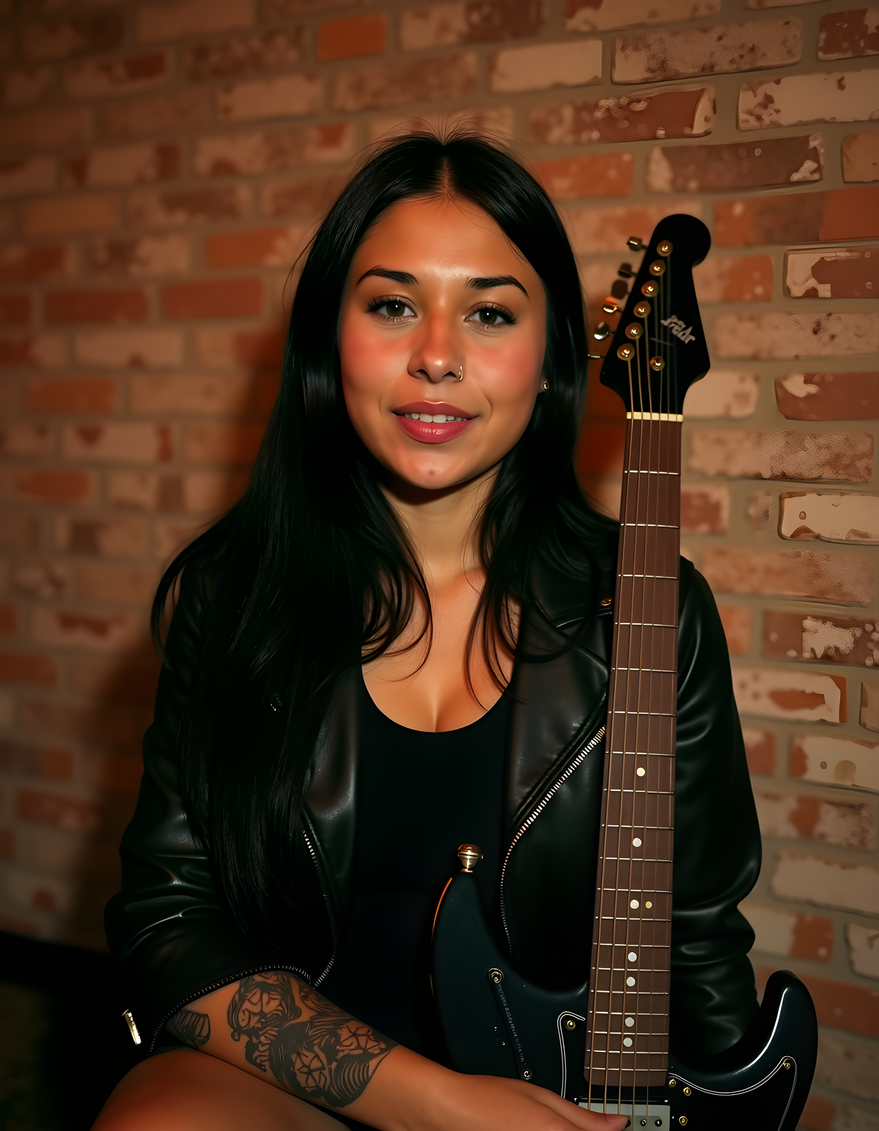 In a dimly lit, vintage-inspired studio bathed in soft, warm amber light, S0PH13R, a woman with long, sleek black hair cascading down her shoulders, is positioned against a brick wall adorned with faded graffiti. Her eyes, a captivating brown, are fixed on the viewer with an enchanting smile that reveals her perfectly white teeth and luscious red lipstick. She dons a tight-fitting black leather jacket, a hint of her pale skin peeking through the frayed edges. The camera angle is low, capturing her from the waist up, emphasizing her slender figure and the intricate tattoos that snake up her arms. Her pose is casual yet confident, one hand casually tucked into the pocket of her jacket, the other resting on a worn, black guitar, creating an allure that speaks to both her rebellious spirit and her undeniable charm.