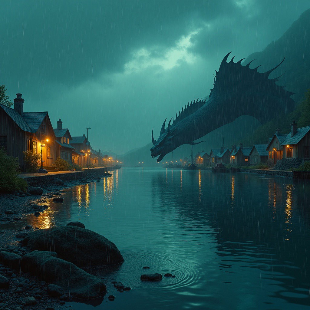 A beautiful composition in the rain. Thematic colors of teal and gold and black. A little harbor town rests in the twilight. The scene is charming with an ominous undertone as the cruel dorsal fin of a sea dragon subtly breaks the surface of the water, its enormous shadowy body quietly lurks below the liquid surface of the harbor’s depths.
