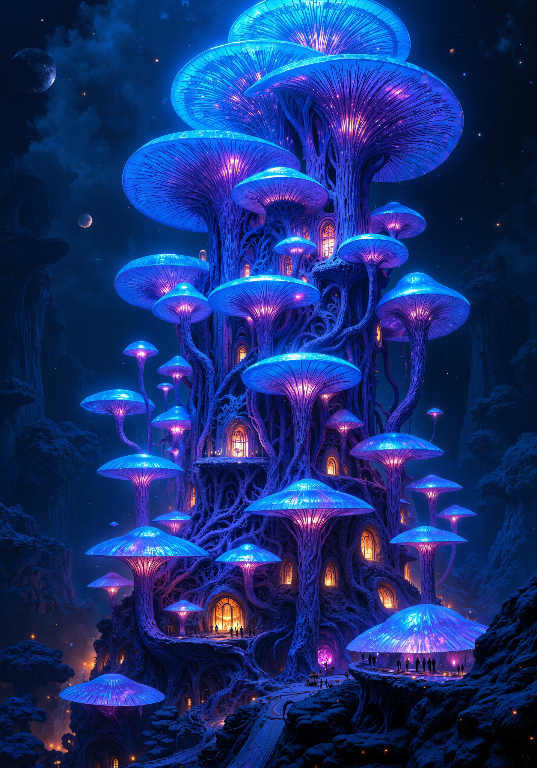 Bioluminescent fungal megastructure, towering alien habitat composed of interconnected, iridescent mushroom-like pods. Translucent, pulsating membranes form walls and ceilings, glowing with ethereal blue and purple bioluminescence. Gravity-defying spores float in spiraling patterns, serving as transportation pods. Tendrils of living mycelium weave through the structure, acting as neural networks and energy conduits. Symbiotic alien lifeforms nest within the structure's folds. Atmospheric mists swirl around the base, refracting prismatic light. Planet's twin moons visible through membrane-thin windows. Intricate, fractal-like patterns etched into the fungal surface. Scale: colossal, dwarfing surrounding alien landscape. Hyper-detailed, 8K resolution, volumetric lighting emphasizing bioluminescent glow. <lora:Hand v2:0.8> <lora:MysticFantasy:0.5> <lora:aidmaFLUXPro1.1-FLUX-v0.3:0.2> <lora:style_of_Norman_Ackroyd_FLUX_100:0.5> <lora:flux_dev:1>