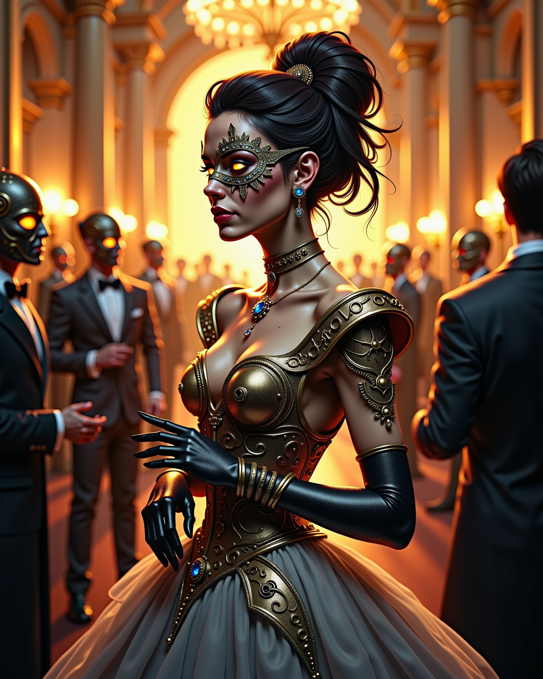 The image is a digital illustration of an enigmatic woman, dressed in a lavish, baroque-inspired gown with intricate, clockwork mechanisms visible beneath the surface, standing within a grand, masquerade ballroom filled with guests wearing elaborate, clockwork-enhanced masks. Her hair is styled in an ornate, curved updo, and her eyes seem to hold the power to manipulate time itself. She wears a delicate, gemstone-encrusted mask that glimmers with a soft, pulsing light, and her hands are adorned with gloves that seem to be made of pure, liquid clockwork. The background is a warm, golden hue, with faint, ticking sounds echoing through the atmosphere. The overall mood is intricate, mysterious, and alluring.