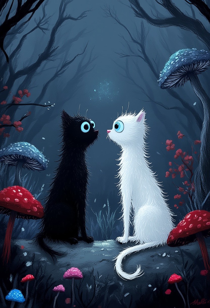 A whimsical illustration of two stretched cats - one pitch black and one snow white in dark whimsical art style, locked in intense stare, surrounded by red and blue bioluminescent mushrooms, digital painting with expressive brushstrokes showing textured fur, misty forest background, characteristic Tim Burton inspired design with matching huge glowing eyes of opposite colors