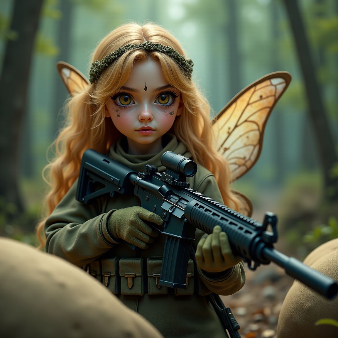 she's a magical and cute fairy but she is also a soldier and carrying an assault rifle, in the magical forest behind some sandbags with a serious expression on her face with camouflage makeup on it