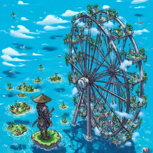 fantastical scene featuring a giant Ferris wheel situated in the middle of a serene blue sea. The Ferris wheel, stylized manga-influenced art style. The subject is a samurai warrior standing side profile to the right. The warrior is depicted in a dramatic, tall structure resembling a celing fan or a tower, transparent, resembling the color of chocolate, verdant island. These islands are home to various tropical plants and small structures, crystal-clear ice cubes and a slice of lime, some featuring red roofs.