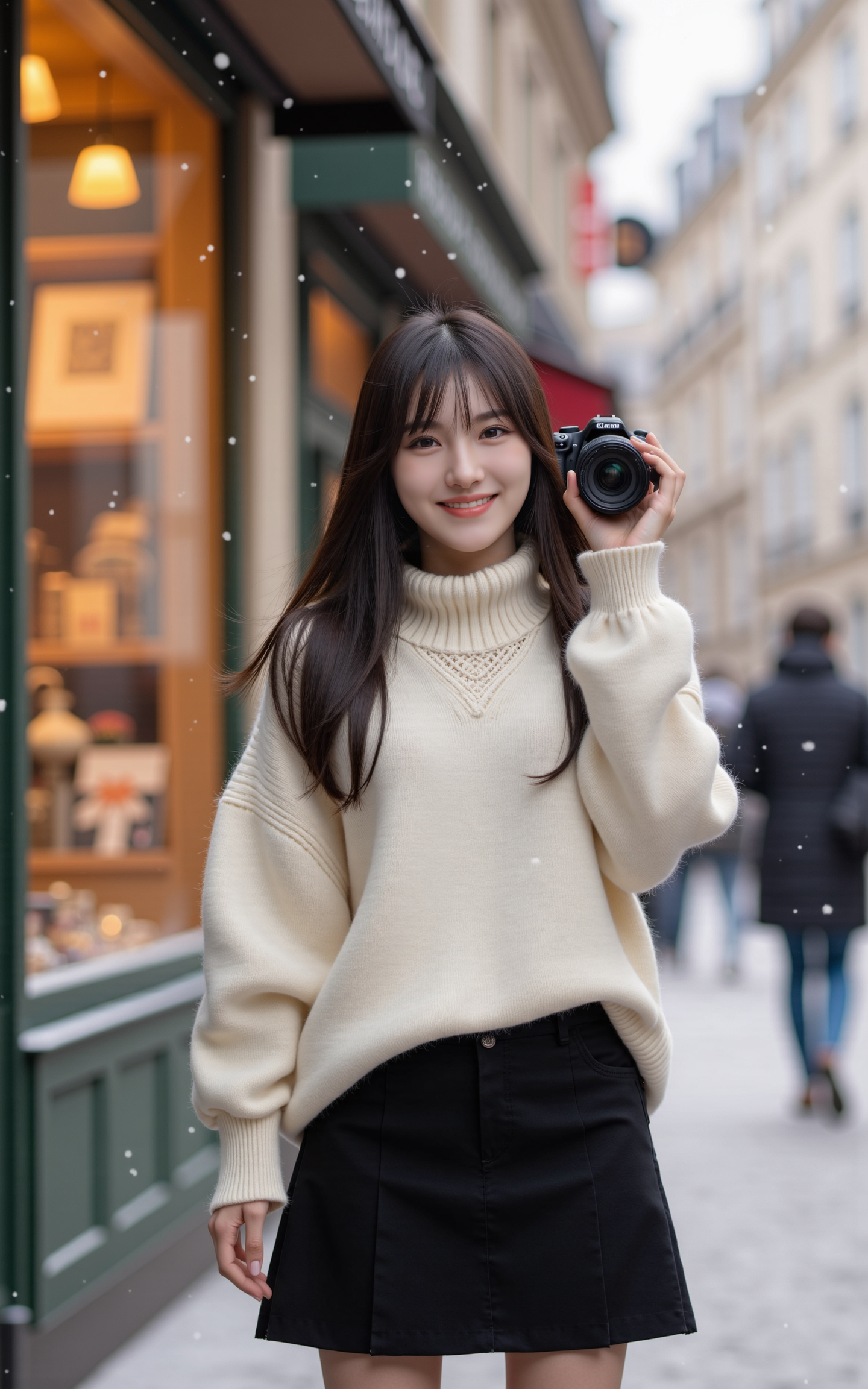 A 20-year-old girl in a white sweater and a black knee-length skirt holds a camera,taking a selfie on a snowy street in a small Parisian town. Behind her,a charming gift shop with a warmly lit display window adds a cozy atmosphere. Snowflakes gently fall around,creating a dreamy winter scene. The image is captured in an ultra-photorealistic style,with soft natural lighting,crisp details,and a cinematic depth of field. Her expression is natural and joyful,reflecting the serene beauty of the moment., <lora:baby-base-01-flux:0.9>,baby,long black hair,bangs,she has a slender physique and a petite build,