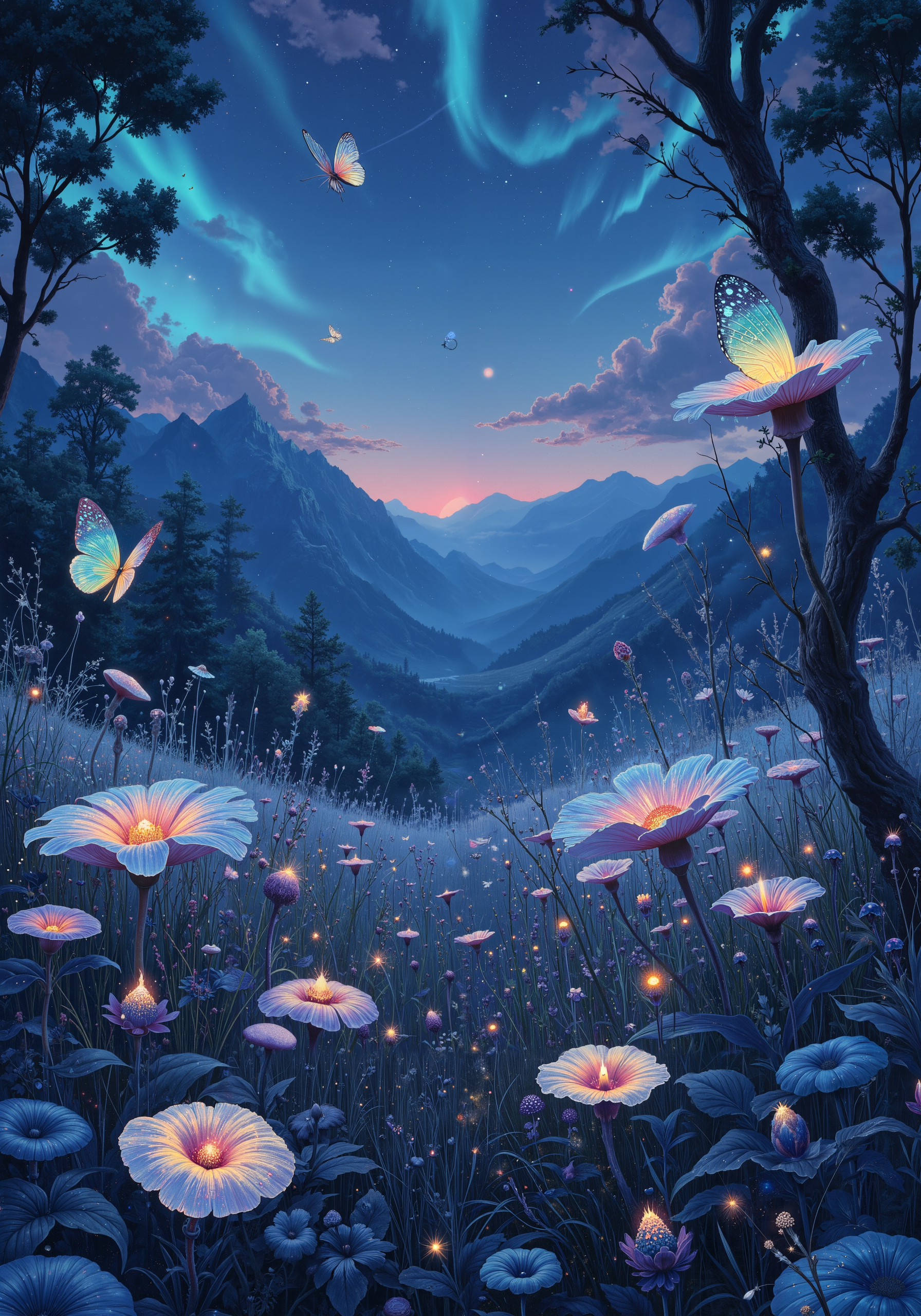 Ethereal meadow bathed in celestial twilight, iridescent wildflowers glowing with bioluminescence. Gossamer mist swirls among crystalline grass blades. Floating fireflies emit soft pulses of rainbow light. Delicate fairy rings of luminous mushrooms dot the landscape. Distant mountains shimmer with aurora borealis. Glistening dew drops reflect starlight. Translucent butterflies with cosmos-patterned wings flutter gently. Wispy clouds tinged with pastel hues drift overhead. Intricate frost patterns on leaves catch moonbeams. Ethereal, dreamlike atmosphere. Hyper-detailed 8K resolution, masterful composition, photorealistic rendering. <lora:Hand v2:0.7> <lora:DND_GRAINYBOYZ_FG_FLUX_V2_ROMULUS_Lora:0.5> <lora:Mezzotint_Artstyle_for_Flux_-_by_Ethanar:0.2> <lora:RM_Animefy_v1.0M:0.3> <lora:Black illusion B:0.2> <lora:RM_JamesJean_v0.5:0.3> <lora:flux_dev:1>