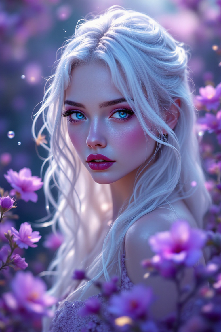 Beneath gradient skies, A masterpiece comes to life—sharp and divine, Volumetric light dances in lines. Her white hair cascades like a silken stream, Blue eyes hold secrets, or so they seem. Raytracing whispers her every detail, Ambient occlusion wraps her in a veil. Evil eyes flicker, yet beauty remains, Sinister shadows play cruel games. Bullying hearts, breaking fragile shells, Yet she stands epic, where darkness dwells. Shiny hair gleams with each subtle sway, Clear skin reflects the dawn's first ray. Ultra-detailed lashes frame her stare, Parted lips breathe an aura rare. Purple flowers bloom at her feet, Butterflies flutter, their wings sweet. Bubbles drift through sidelit air, Water drops glisten—a world laid bare. Depth of field pulls you close to see, The girl who dares to simply be. Looking at the viewer, she draws you near, Her presence both haunting and clear. In 8K resolution, the scene unfolds, CG magic woven into gold. Best quality, absurdres dreams made real, This portrait captures what words can't reveal. From WLOP’s touch to this solo art, She is the axis around which worlds start. An ultra-detailed vision, timeless and vast, A purple-themed moment forever to last.