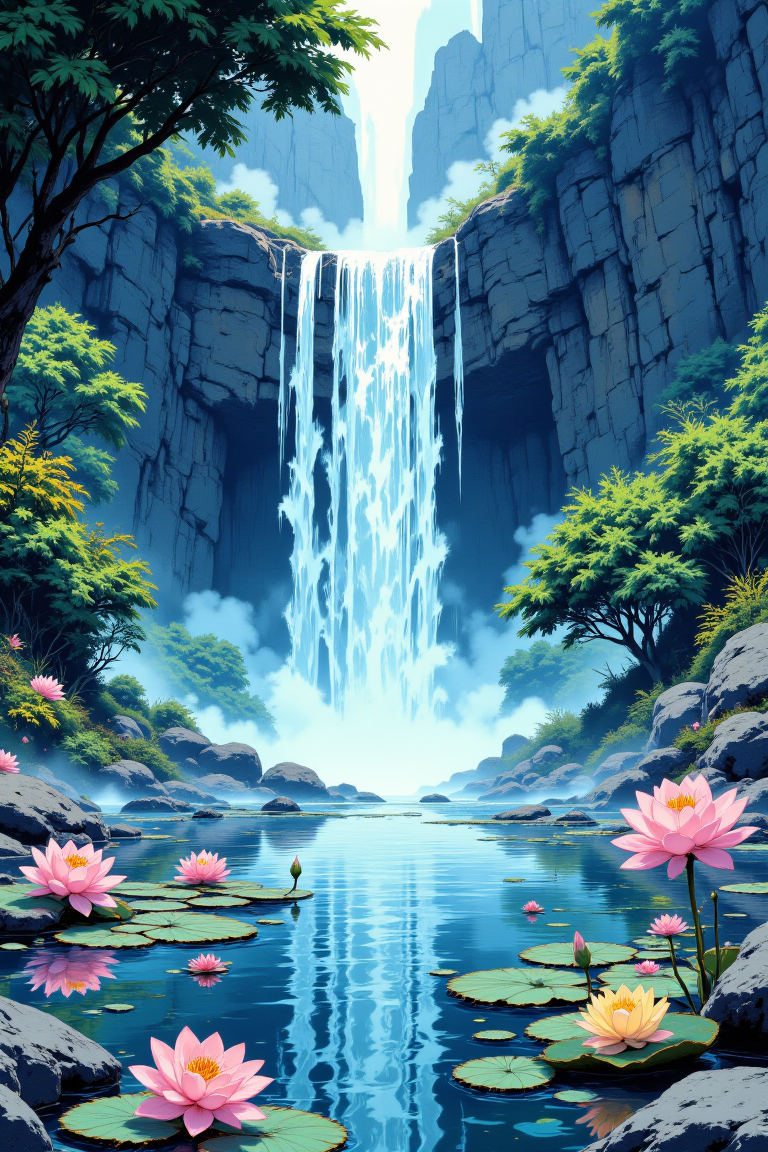 j_art. ,aidmafluxpro1.1. a scene in anime movie-A breathtaking waterfall cascades down a rocky cliff, its misty spray creating an ethereal atmosphere. Lush pink LOTUS FLOWERS frame the scene, dozen of light blue and pastel yellow lotus flowers floaring. in pool.The reflection of the waterfall in the still pool creates a mesmerizing visual spectacle. The image captures the beauty and tranquility of nature, inviting viewers to immerse themselves in its serene embrace.Gloden colours hues,PhotoRealIllustration,PhotoRealXdrawing,MYNIJIpotrait,anime styles and aesthetics