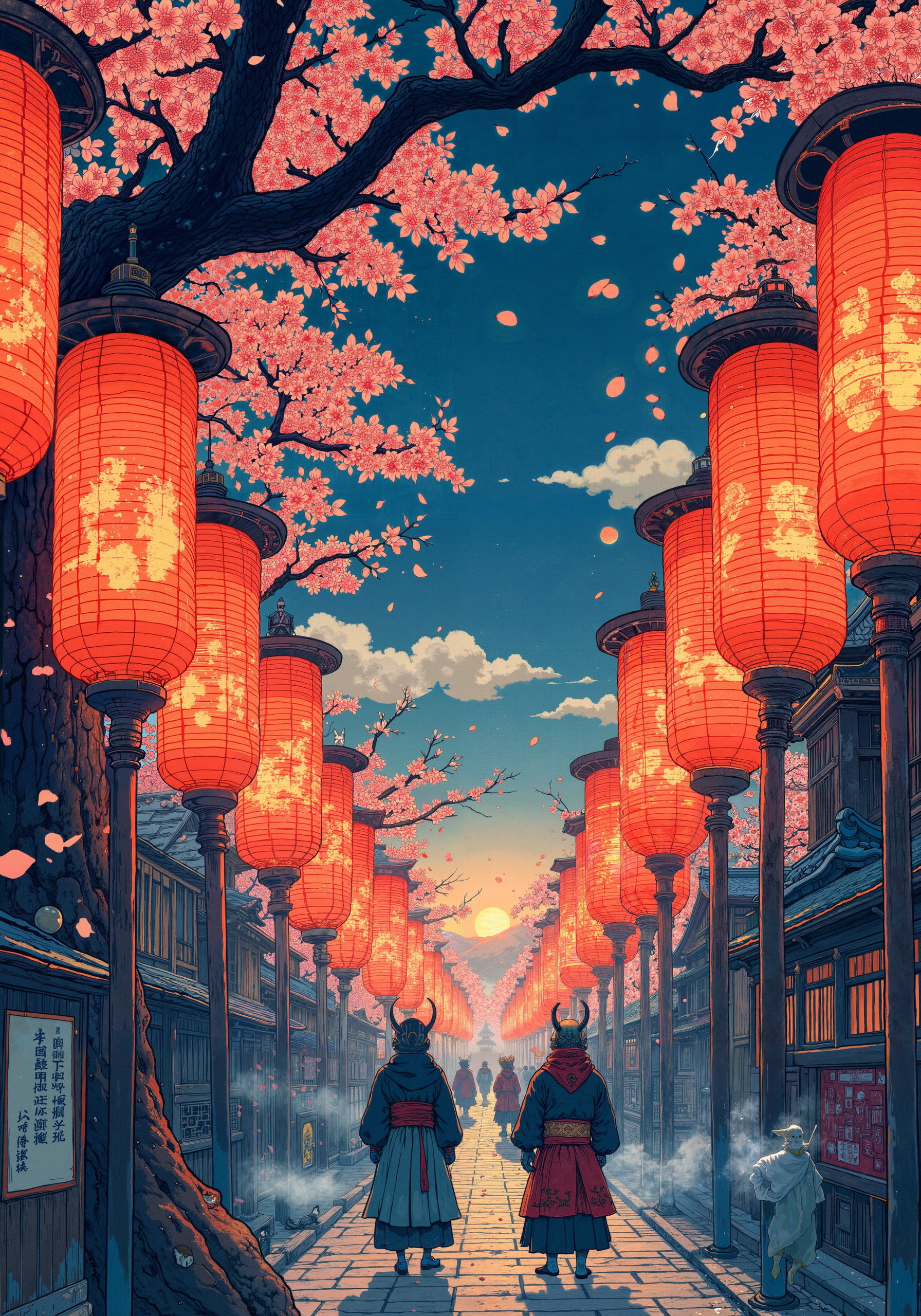 Ethereal nihonga painting on hand-crafted washi paper depicting an ancient matsuri procession beneath illuminated cherry blossoms at twilight. Mineral pigments in deep indigo, vermilion, and gold leaf create a dreamlike atmosphere where masked kagura dancers move through swirling sakura petals. Traditional asymmetric composition places towering red chochin lanterns along a winding shrine path, their warm glow contrasting with cool twilight shadows. Delicate ma (negative space) surrounds spirit foxes observing from misty peripheries. Meticulous nihonga techniques render fabric textures with tsujigahana-inspired patterns, while distant mountains echo ukiyo-e sensibilities. The scene embodies yugen â profound mysterious beauty â as divine and human worlds momentarily converge during this sacred seasonal transition. <lora:ck-charcoal-drawing-000014:0.1> <lora:openart_Surreal_Anime_III_20250104_025344:0.2> <lora:RM_Artistify_v1.0M:0.3> <lora:flux_dev:1>