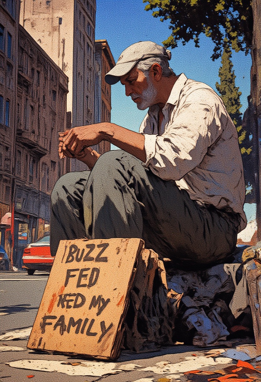 4k quality, (Perfect hand), anime, (masterpiece), (detailed face), detailed A man with short, homeless man sitting on the curb in downtown Los Angeles. He is holding a sign on a piece of cardboard that says "Buzz to feed my family" in English text.